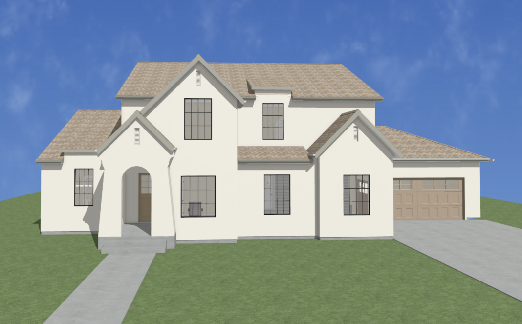 a french country spanish style villa all cream stucco with a light brown roof a light brown front door a manicured lawn with trees scattered behind mountains behind the trees native shrubs in the landscaping a soft blue sky with white clouds that soften the scene