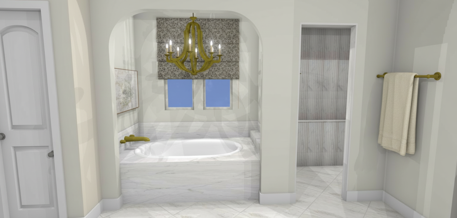keep everything as is but add one brass towel bar with a cream towel to the furthest right wall of the image lower the towel bar a foot closer to the floor add one shower head on the back wall of the shower