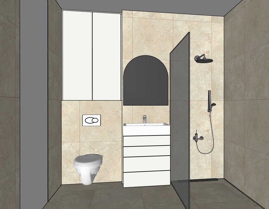 bathroom keep same interior design same materials and colors same furniture and lighting add lamp above the mirror
