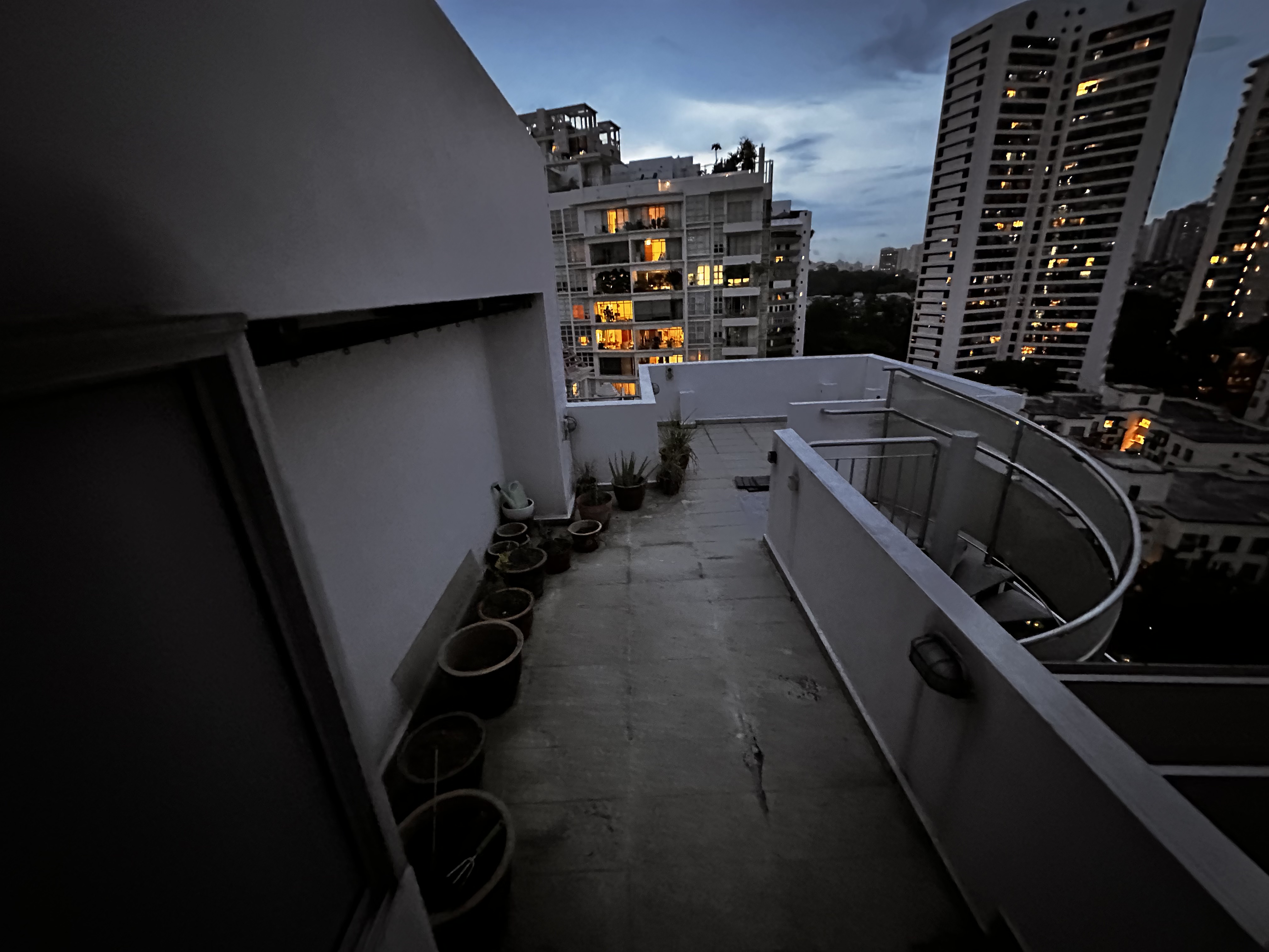 interior shot luxury resort balcony warm teak wood decking glass railings lush tropical plants in large stone planters ambient warm lighting beige outdoor lounge furniture white plaster walls architecture