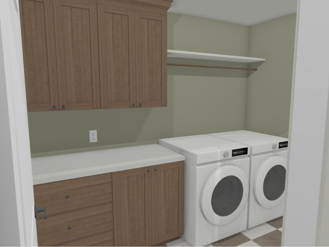 a french country style laundry room with a checkered floor and warm wood cabinets no windows