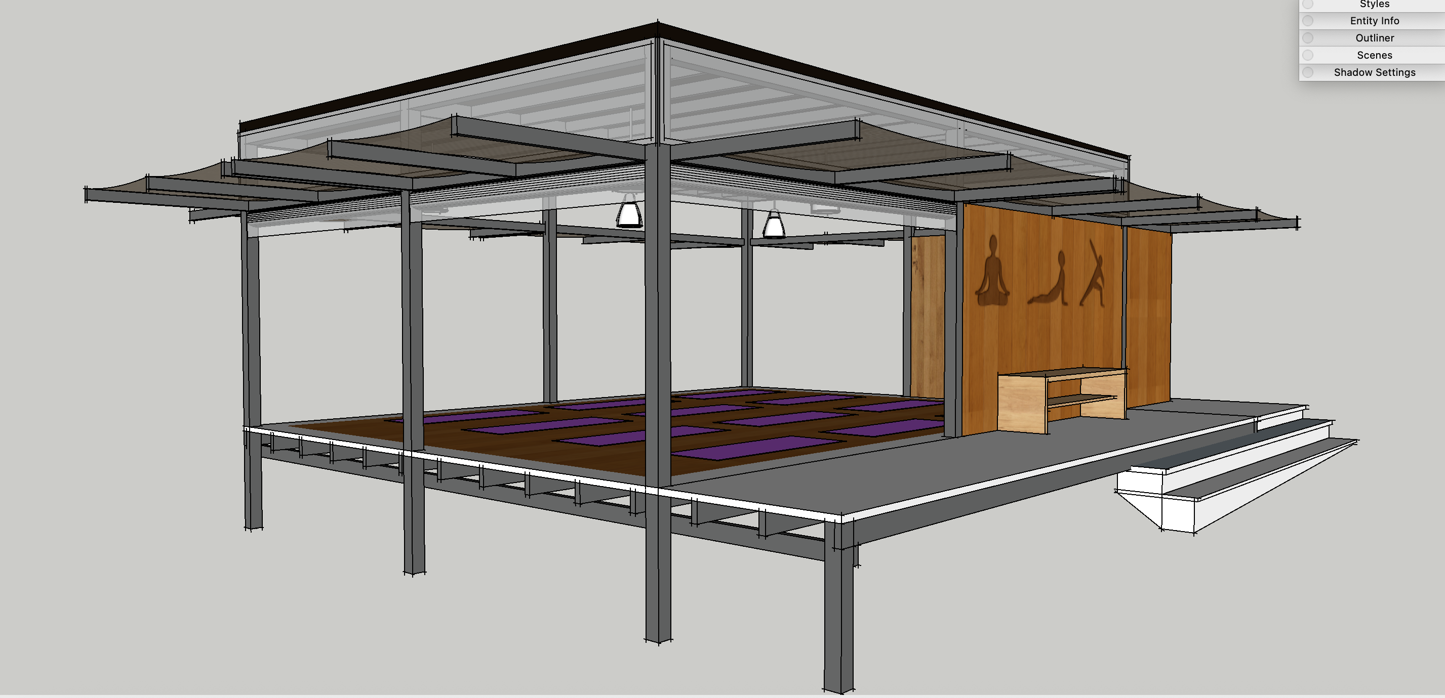 dark anthracite color steel framed yoga platform warm atmosphere surrounded with old olive trees untapered land greyish gravel stones under the platform lights on