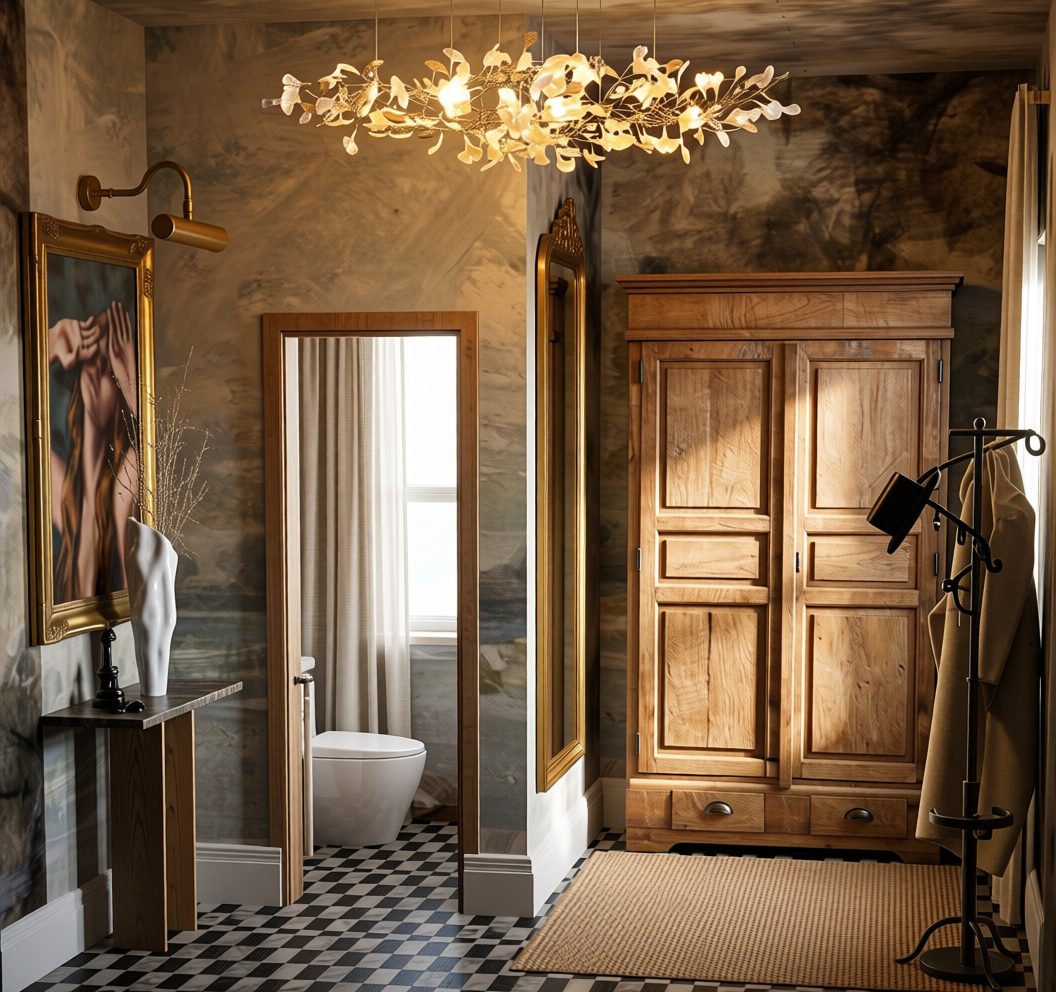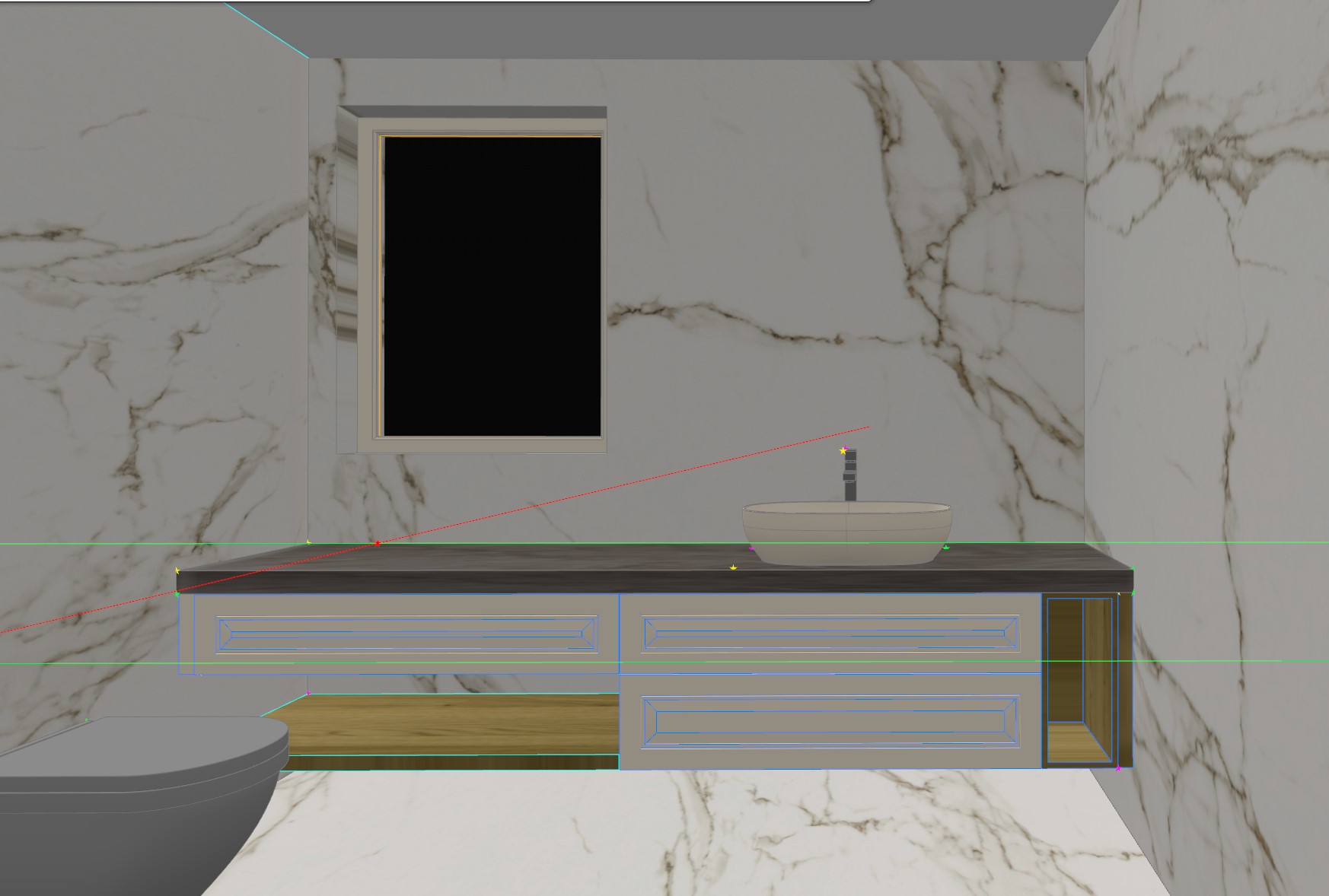 there should be a modern mirror above the sink let the sink be white let the window frame be white outside during the day and with a garden view