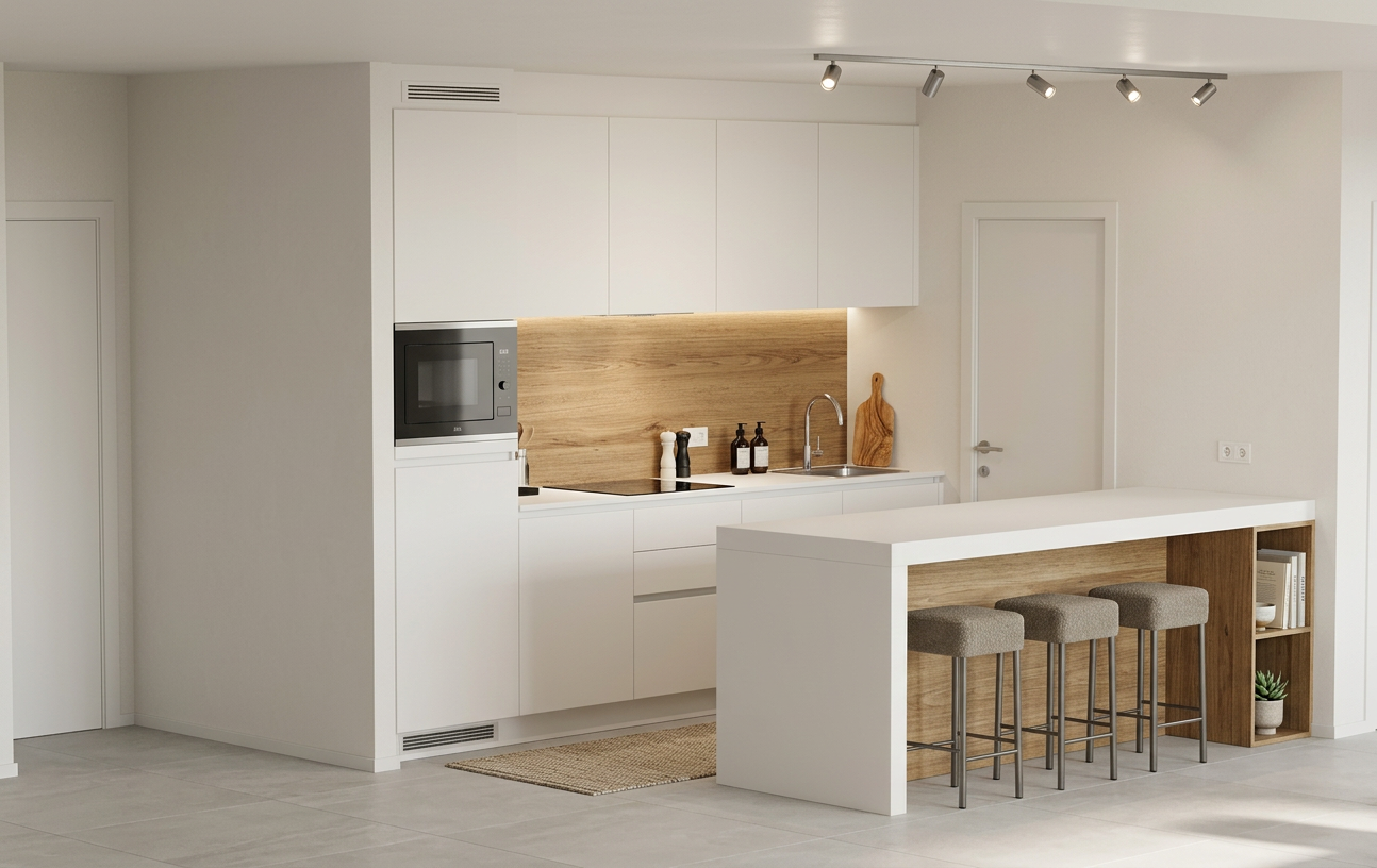 encimera desayuno gruesa al aire en madera roble natural vitrina con iluminaci n interior