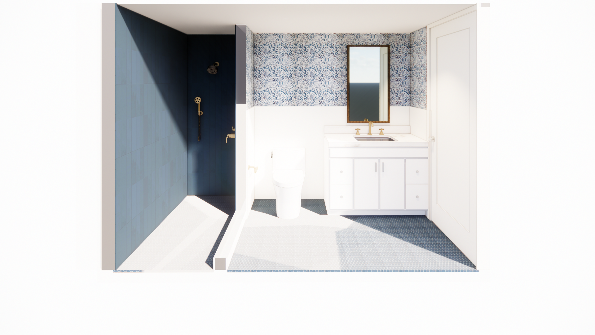 make the wallpaper scale 2x larger do not change pattern make floor tile darker navy blue keep hexagon pattern for floor