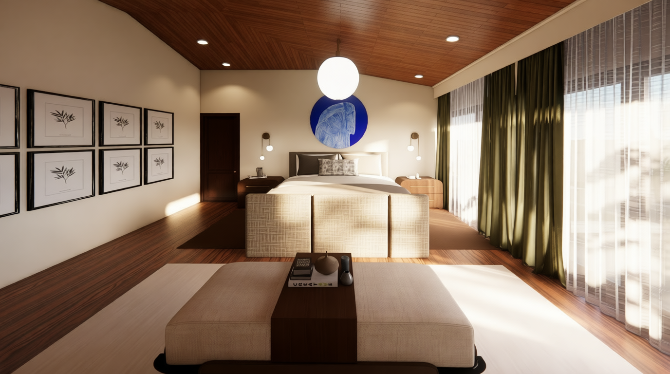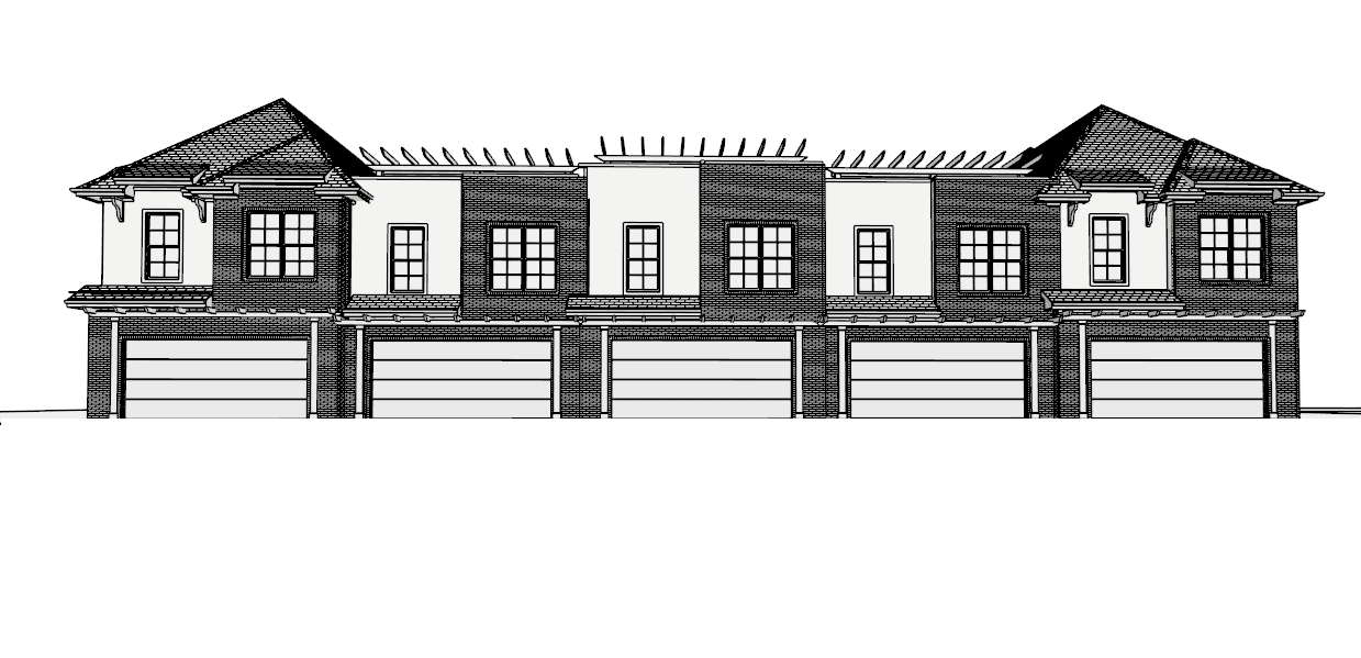 create a realistic scene do not add any architectural elements add trees and shrub that compliment the building and the scene do not block the building with trees the materials for the exterior of the quadplex is a light white stucco and light brown brick