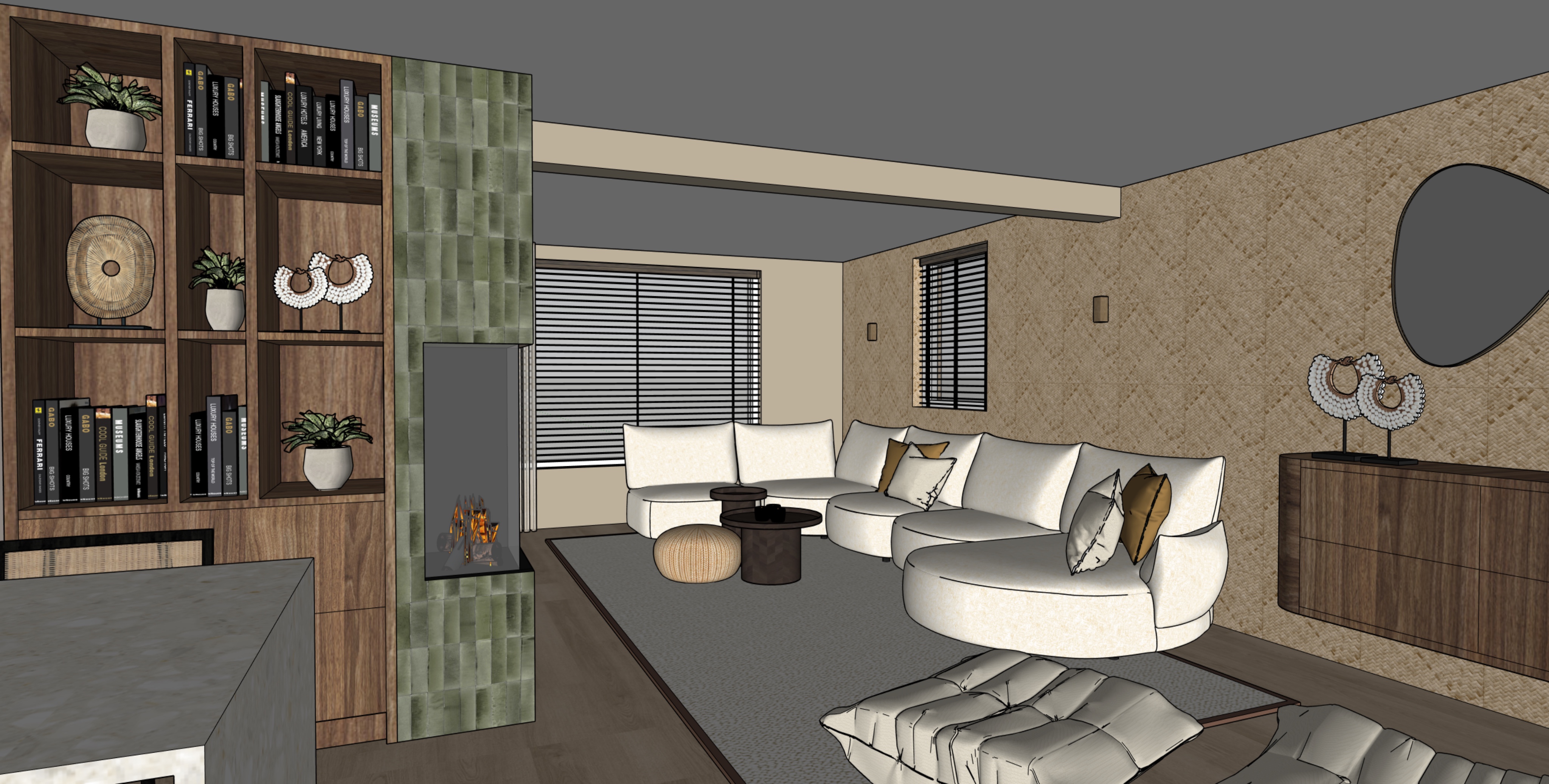 render of 3d model turn the wall lights on and let natural light come through the windows on the back make real fire in the fireplace and turn the lights on in the cupboard on the left there is natural light coming from the back through a window we can t see