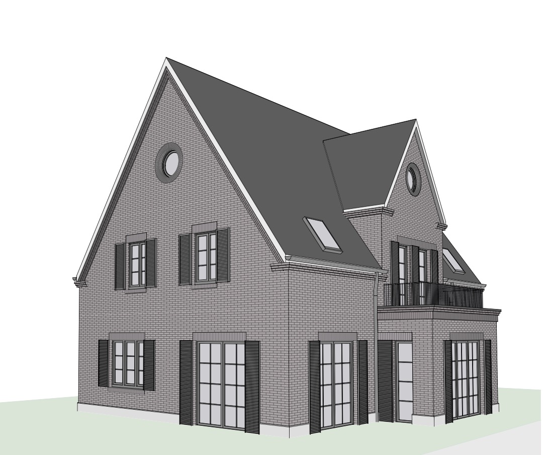 visualisierung einer stadtvilla im klassischen stil alle proportionen ffnungen und bauteile fenster d cher tore umfassungen gesimse aus der skizze exakt beibehalten nur materialit t licht umgebung und detailtiefe realistisch ausarbeiten dach satteldach mit deckung mit flachen dachsteinen in dunklem anthrazit materialit t hanseatisches blau rotes klinkermauerwerk putz grau beige f r sockel hellgraue holzfenster hochwertige handwerkliche anmutung vordergrund au enanlagen gro z gige gartenanlage mit rasenfl chen b schen und str uchern b umen ein gro er alter laubbaum im hintergrund 3 5 personen auf einer terrasse rechts vom haus umgebung parkartige landschaft mit alten b umen gepflegter rasen g rtnerisch angelegten b schen ruhige hochwertige atmosph re lichtstimmung weiches tageslicht leicht sonnig nat rliche farben realistische schatten betone die tiefenstaffelung durch realistische schatten in den r ckspr ngen keine flachgeb gelte fassade kameraposition perspektive auf augenh he leichte distanz vollst ndige fassadenansicht keine extreme weitwinkelverzerrung kamera leicht 3 4 frontal nur minimal keine starke perspektive damit die tiefenstaffelung der bauk rper klar lesbar ist stil realistische architekturrendering visualisierung hochwertige wettbewerbsdarstellung keine menschen im vordergrund dominierend ruhige szenerie qualit t hohe detailtiefe realistische materialien fotorealistisch klare geometrie ruhige komposition