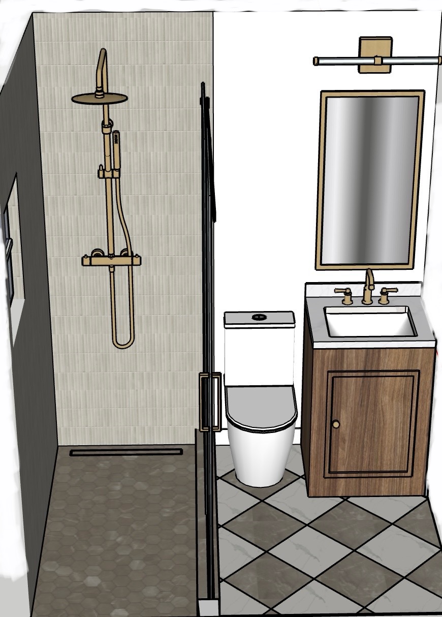 a cozy and modern bathroom with a minimalist design the walls are white creating a calm and relaxed atmosphere the shower walls features glossy vertical fluted porcelain tile warm bone ivory color subtle tonal variation height of 4 inches narrow width of 5 8 of an inch reeded texture minimal modern aesthetic soft light reflection seamless grout clean architectural finish on the floor it features honeycomb patterned tiles in taupe complementing the matte brass shower head and fixtures the glass shower door is crystal clear adding elegance to the space the floor is adorned with diamond patterned tiles in alternating white and taupe adding a touch of sophistication the vanity is a sleek white with a wooden base matched with brass faucet fixtures the mirror above the vanity is framed with the same brass golden touch soft natural lighting comes from a frosted window casting a soothing glow throughout the room