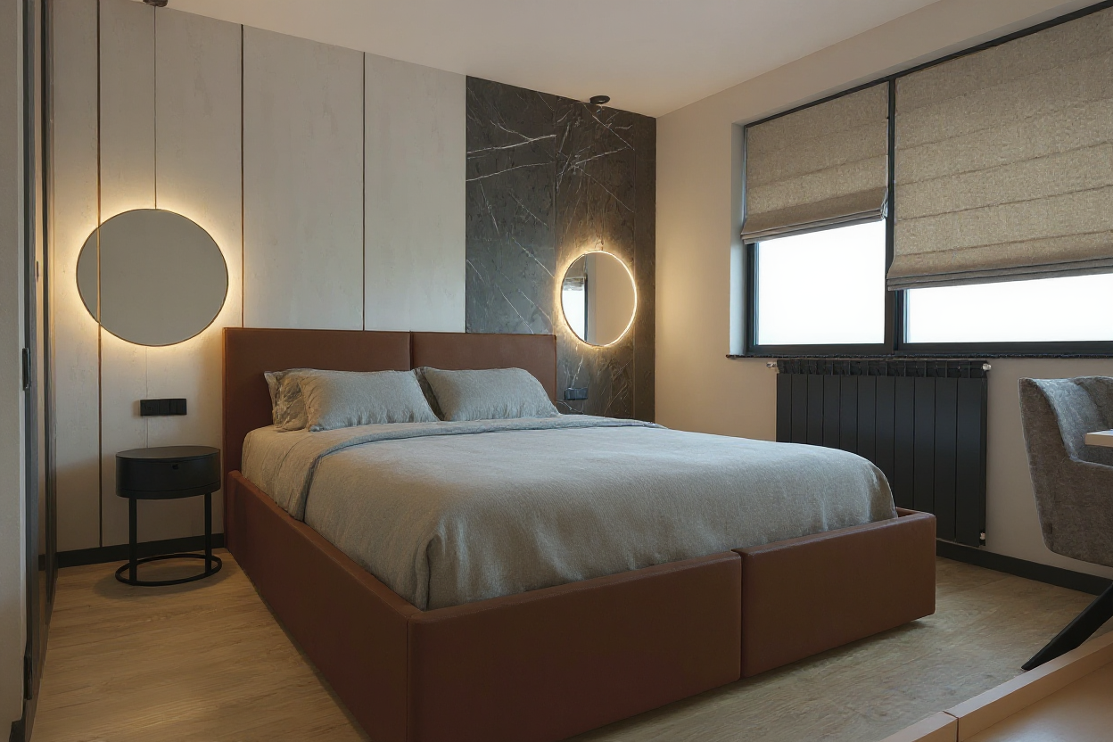 make photorealistic add driveway and front walks landscaping with river rock bright sun on face of house black asphalt shingle roof cedar shakes in gables dark brown board and batten very dark green trim and siding low mountains in background