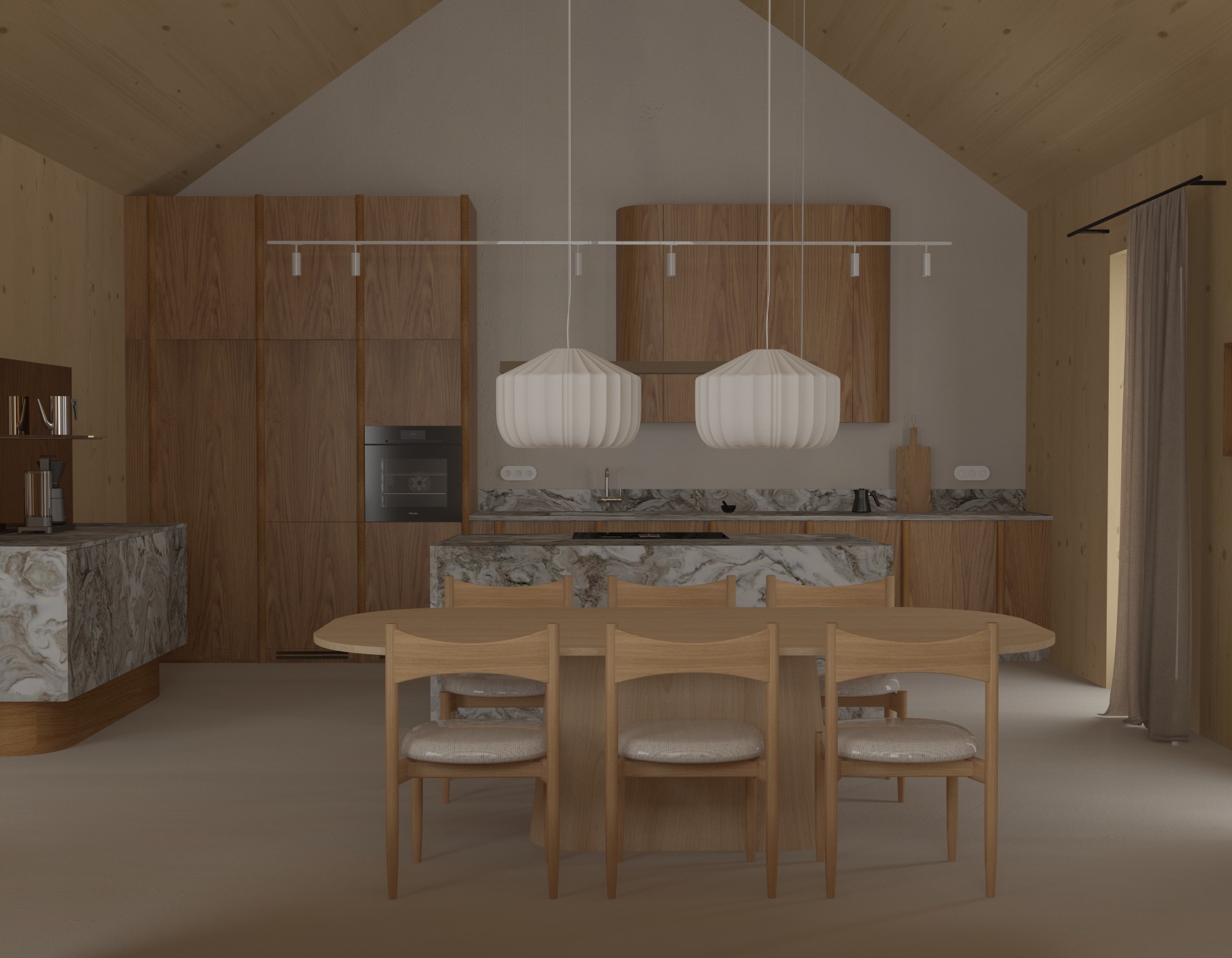 architectural photography ultra realistic 8k resolution cinematic lighting maintain original geometry kitchen wood elements strictly preserve the exact original wood color tone and saturation from the base image do not lighten the kitchen cabinetry walls smooth knot free clt panels in a natural pale light wood tone floor and far wall seamless beige microcement curtains translucent white linen soft light diffusion lighting soft morning sunlight streaming from the right side kitchen island semi matte natural stone dining table matte knot free oak wood pendant lamps minimalist white fabric texture highly detailed textures realistic grain soft shadows