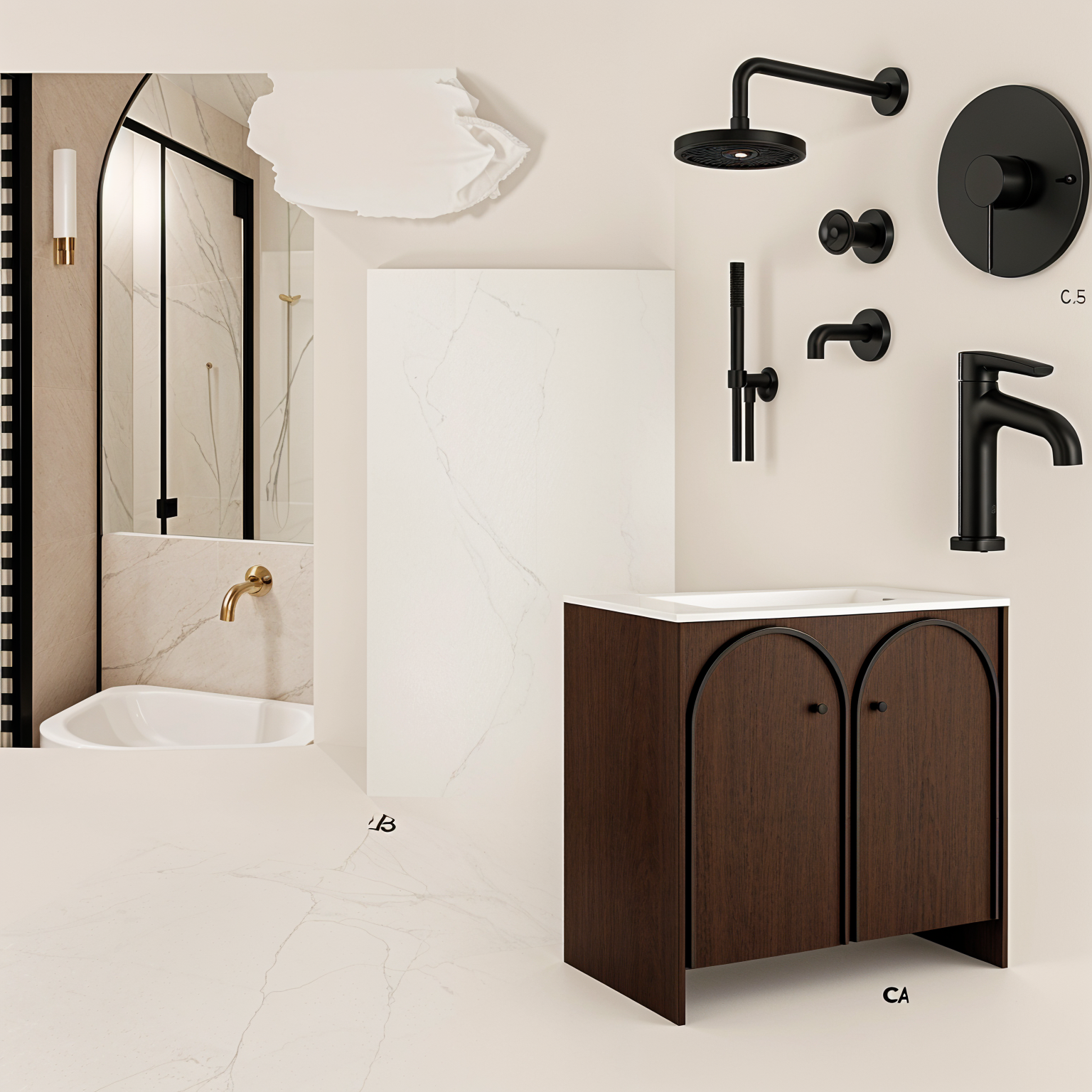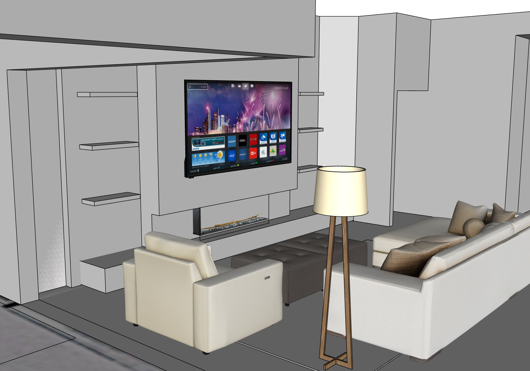 make photo realistic render to a luxurious and serene great room featuring a open sided electric glass fireplace full height custom fireplace wall clad in light natural stone with subtle horizontal veining large flat screen television wall mounted and centered above a slim linear gas fireplace with realistic flame and soft glow stone hearth bench runs the full width of the wall with concealed warm led underlighting