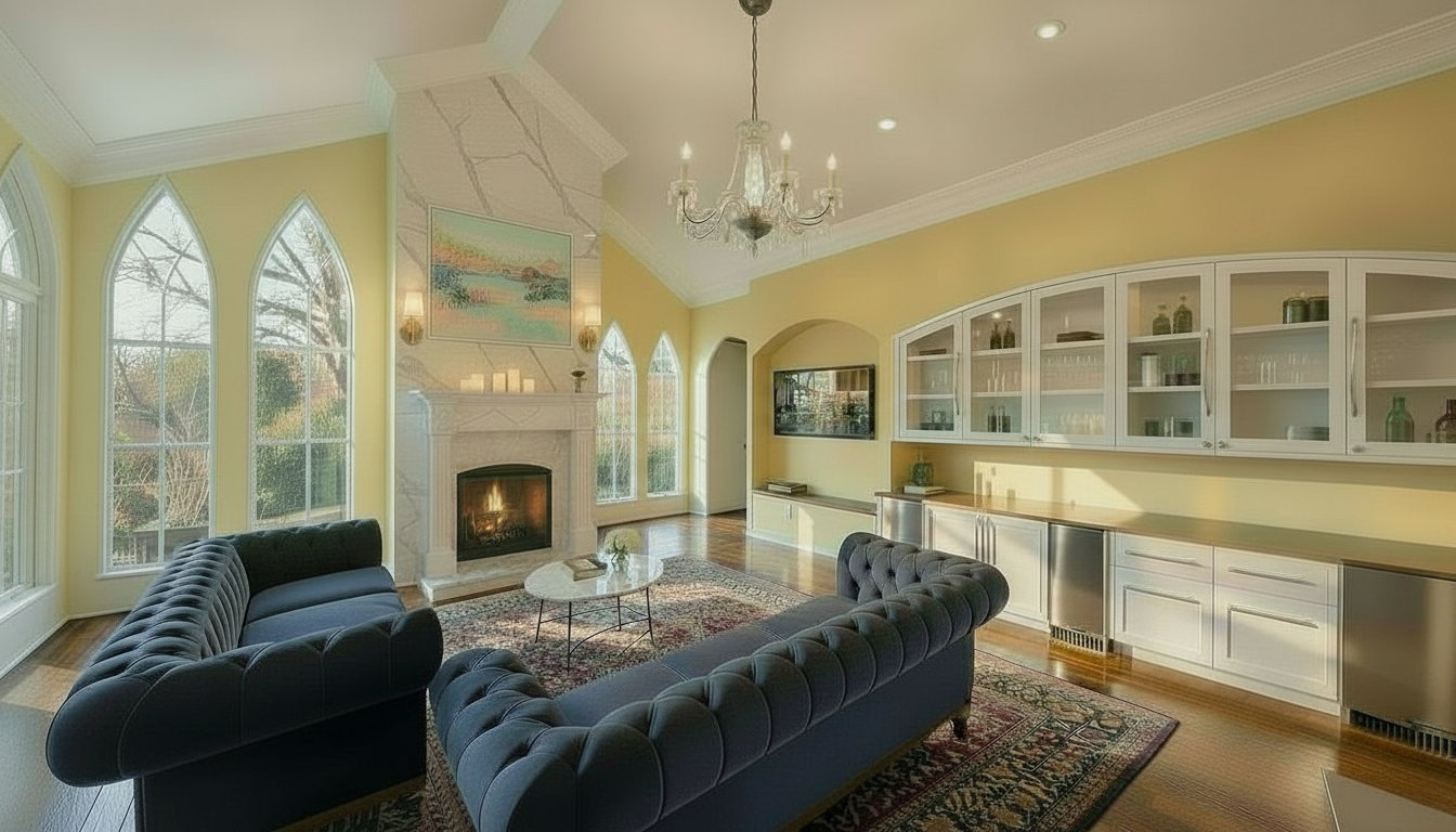 keep everything the same in this image other than match fireplace style to reference image match window style to reference image match wall color to reference image