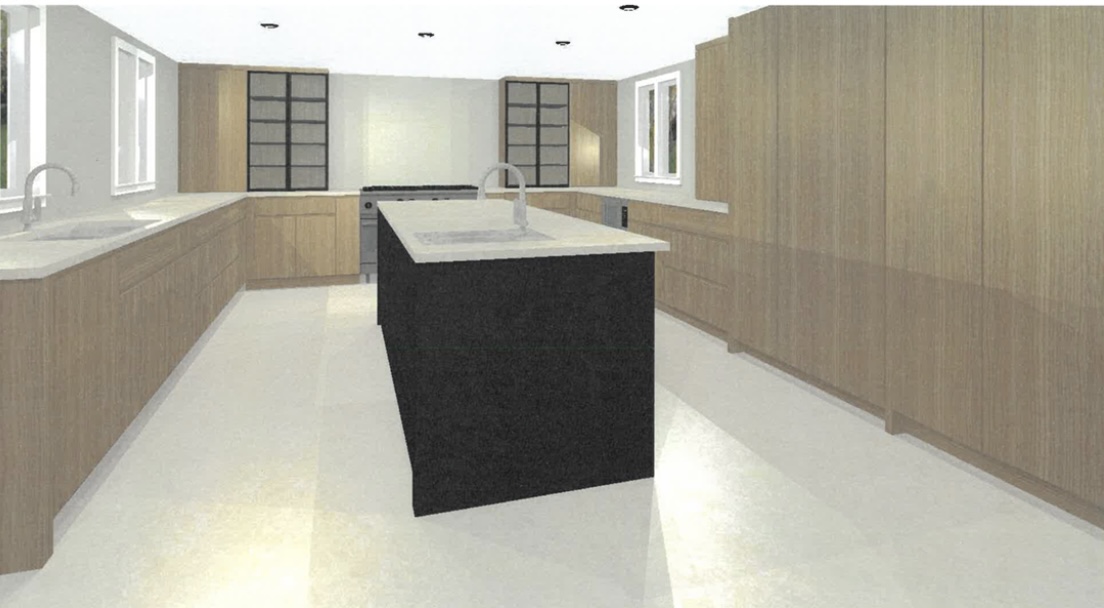 change flooring to 8 wide white oak natural stain faucets to be matte black countertops to be taj mahal
