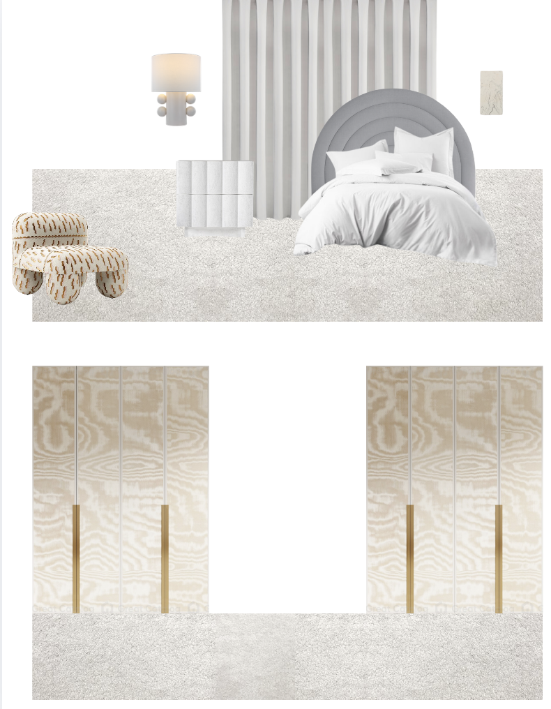 soft sculptural modern bedroom with warm neutral palette maintain layout based on moodboard composition bed centered with curved upholstered headboard in light grey fabric bedding in soft white layered textiles with natural folds feature wall behind bed with vertical fluted panels in light neutral tone flooring is plush textured carpet in warm cream custom wardrobe cabinetry in light natural wood with subtle grain and long vertical brass handles additional accent pieces include sculptural boucle lounge chair with warm patterned upholstery and soft rounded form lighting is soft and diffused with modern wall sconces in warm neutral tones materials are highly detailed with realistic fabric texture subtle imperfections and natural variation soft daylight combined with warm ambient lighting calm minimal luxury atmosphere photorealistic interior render no stylization no illustration