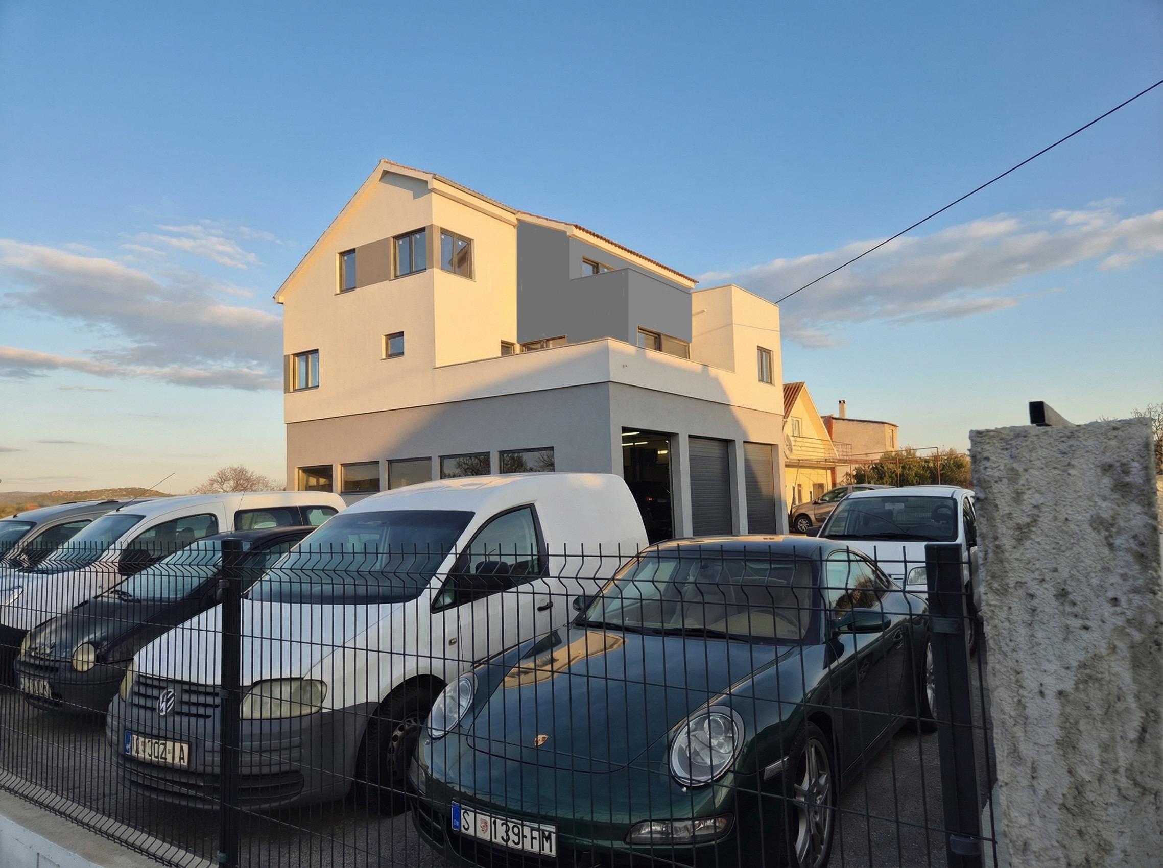 exterior shot apply terracota colour to gray parts of the facade and cream colour to beige parts