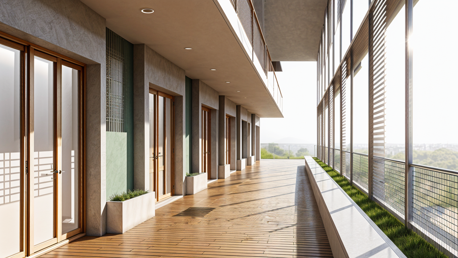 la suspension lumineuse est clair e on peut ajouter des quelques spots dans le couloir par les fen tres on a une vue sur de la v g tation et des petite immeubles les suspensions lumineuses sont clair es les montants des cloisons mobiles sont blanc respecter les cloisons vitr es avec stores et les cloisons pleines gris clair mat les assises des chaises sont blanches