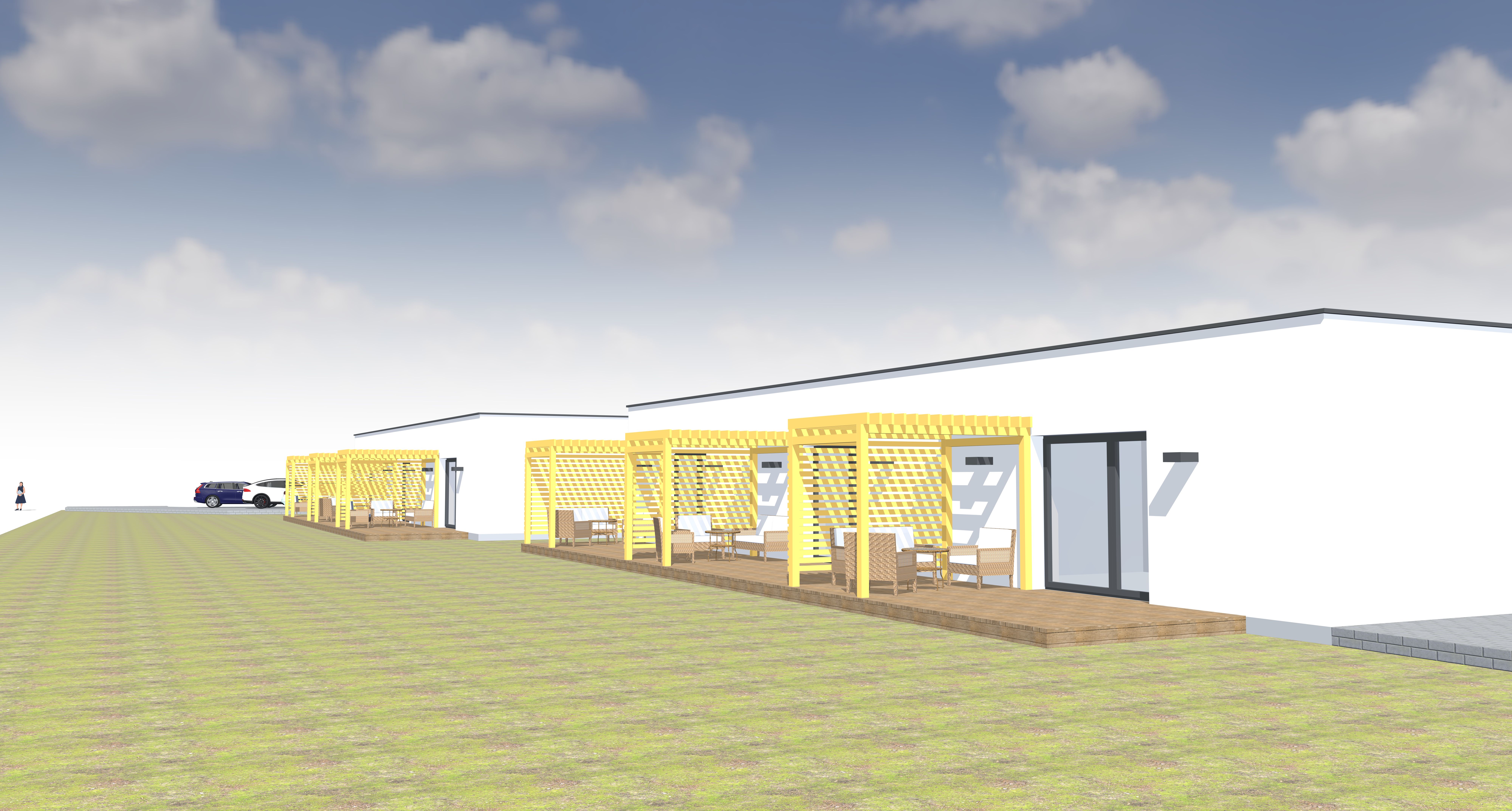 render a contemporary duplex house with a light beige exterior facade and a dark brown flat roof include medium sized windows with dark gray frames feature a modern front entrance with a sleek awning above the wooden front door set against a paved pathway in a neutral gray tone surround the house with well maintained green bushy hedges and a small patch of lush green grass place a stylish black and white scooter and a black bicycle near the entrance ensure the scene is set in a calm and serene atmosphere with soft natural lighting highlighting the minimalist and elegant design of the house