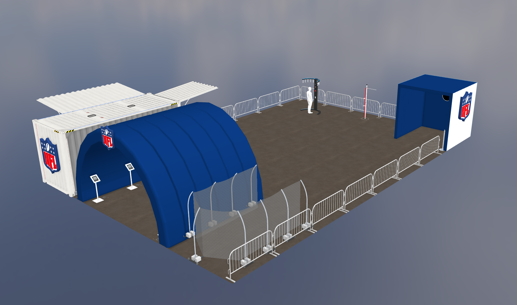 transfrom the provided nfl experience into a high end photorealistic render during the middle of the afternoon set inside a street fair environment with high energy and lots of people moving throughout the front entrance is the blue inflatable that has 6 ipads inside people are engaged and using them as they enter through the tunnel they are met with employees helping them guide them through the ipad apps once inside there multiple activations in the back there is a photo opportunity and we have a shipping containers for retail the shipping container is 20 width x 10 deep by 10 high the inflatable entrance is 20 w x 12 high x 16 deep the photo app in the back is a 10 x 10 x 10 cube that people enter into