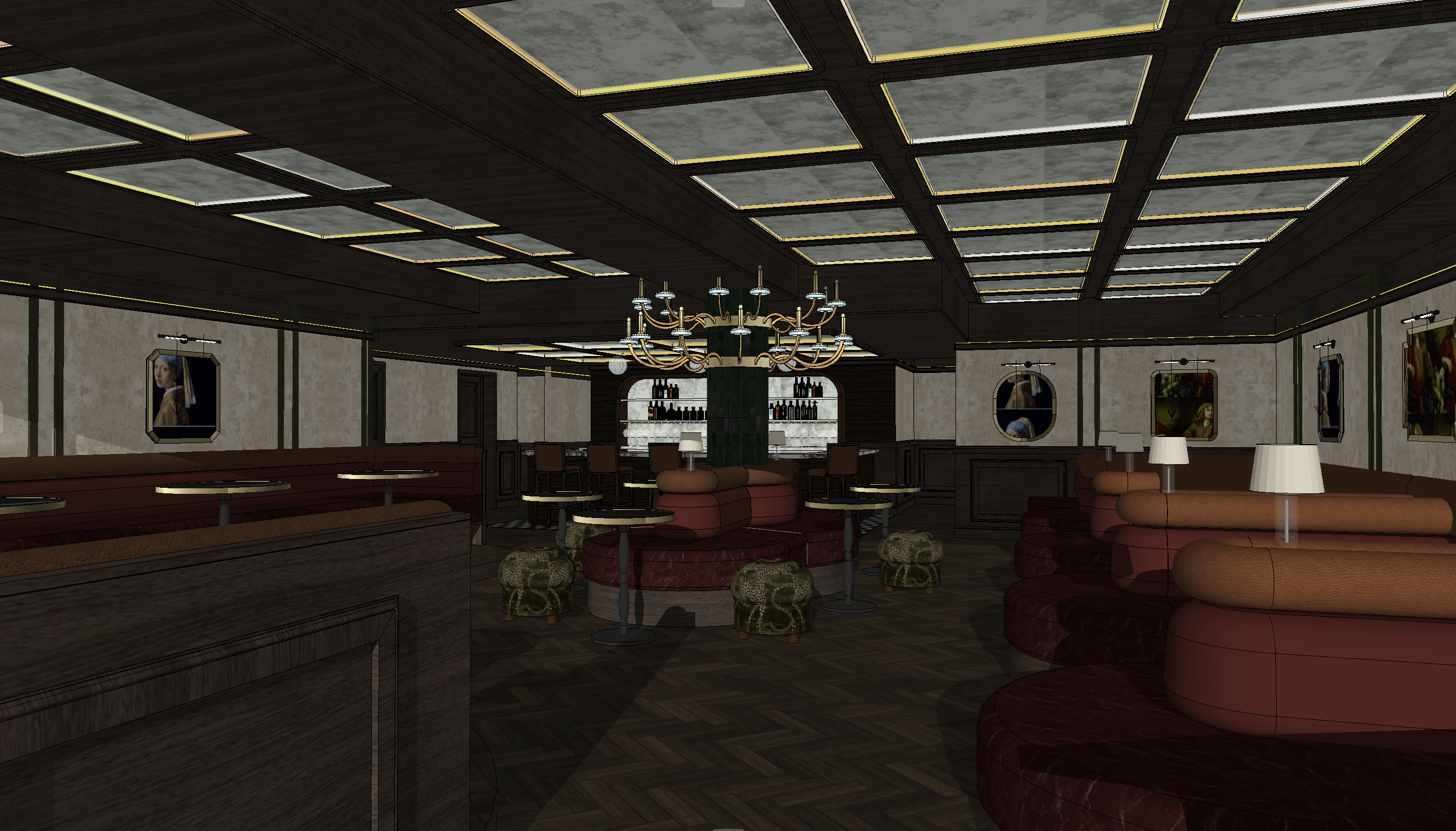 a bright ultra realistic render of a vintage new york restaurant interior keeping the exact camera angle and geometry dark oak herringbone parquet flooring rich and textured deep burgundy faux leather banquettes with warm brown leather backrests high bar stools in soft brown upholstery round and square tables made of black calacatta marble with polished brass edging central structural column clad in deep green glossy tile surrounded by a large sculptural gold chandelier with crystal drops walls finished in aged vintage italian plaster with soft patina antique paintings in heavy carved gold frames each illuminated with picture lights ceiling composed of dark oak coffered panels with led perimeter lighting inside each coffer and antiqued mirror inset panels reflecting warm highlights over the bar and lounge glowing ribbed glass globes bar countertop and dj booth top made of viola calacatta marble with rich veins lighting is bright and balanced filling this naturally dark space with soft warm illumination while preserving depth and atmosphere led strips chandelier glow picture lights and marble reflections create a refined elegant cinematic look high end hospitality rendering photorealistic materials premium textures crisp detail true to life light behavior realistic reflections no change to the original camera view