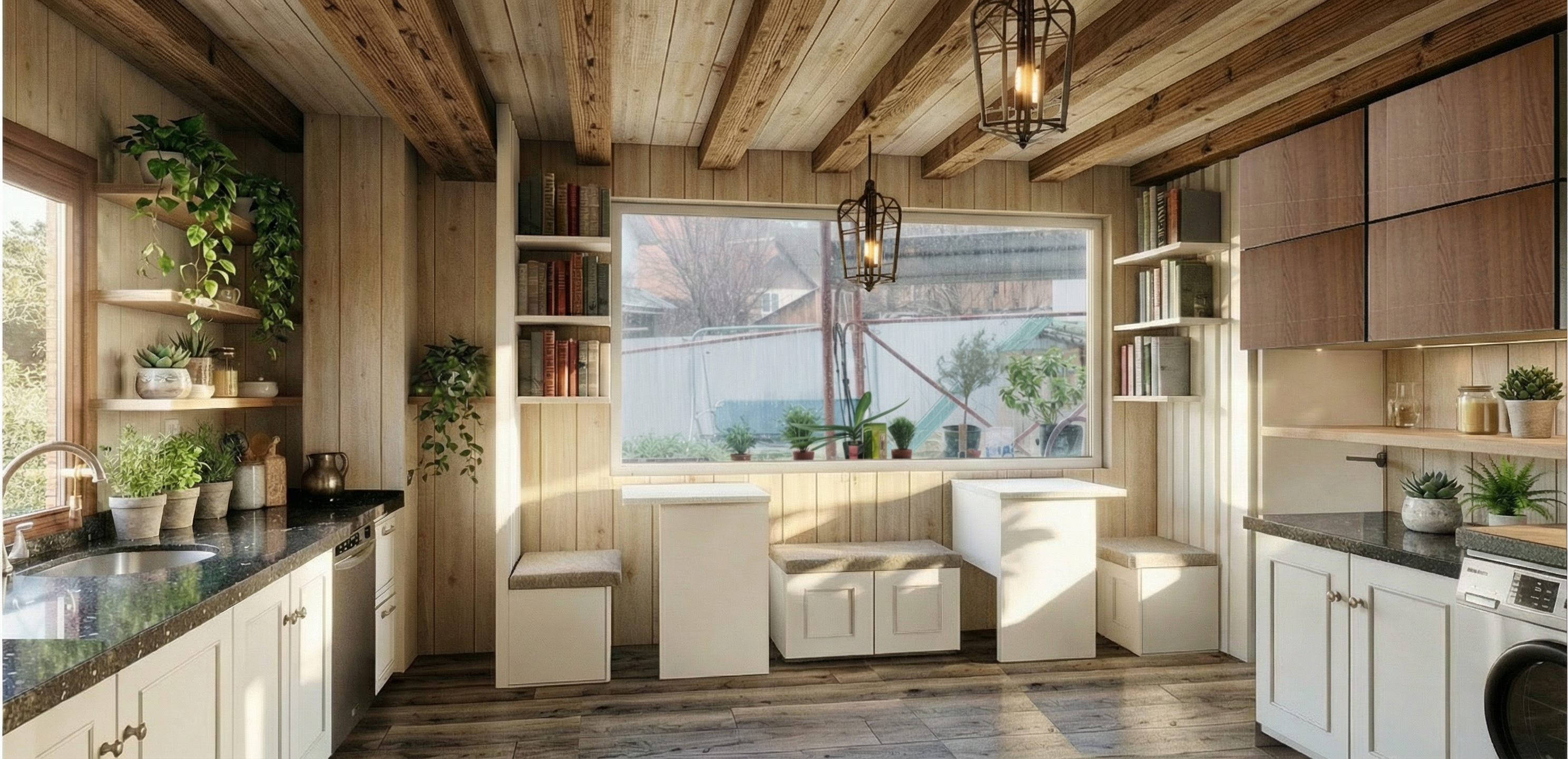make floors natural light walnut matching the existing cabinets add sink on counter with black faucet and beige grey stone counters with floating shelves above