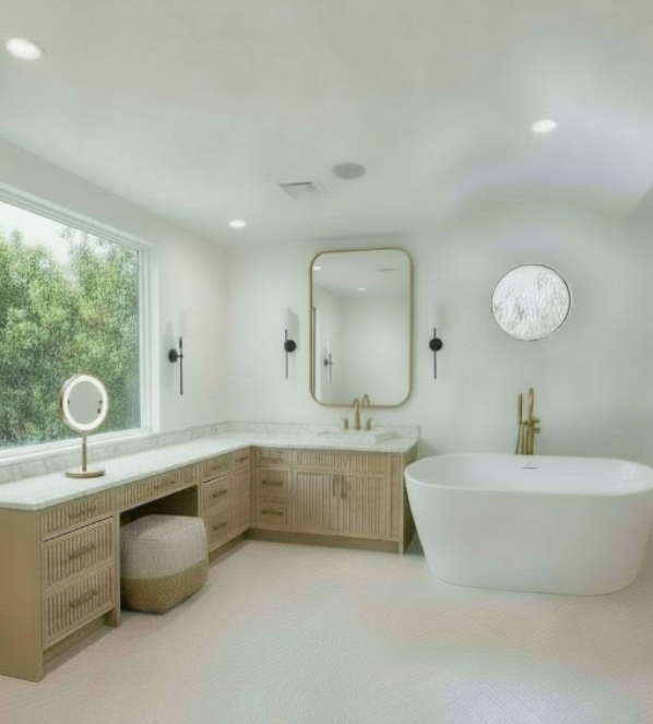 add a tall ceiling height cabinet to the right of the tub