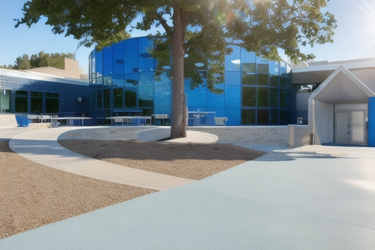 generate a digital rendering of a modern building with a glass facade framed in vibrant blue the building is set against a lush green grassy hill with a large tree in the foreground its leaves casting soft shadows the path leading to the entrance is a smooth light gray contrasting with the vivid greenery blue picnic tables are placed near the building adding a pop of color the atmosphere is calm and inviting with a clear blue sky creating a serene bright setting there are students sitting at the blue picnic tables on the patio and more students that you can see through the glass inside architecture
