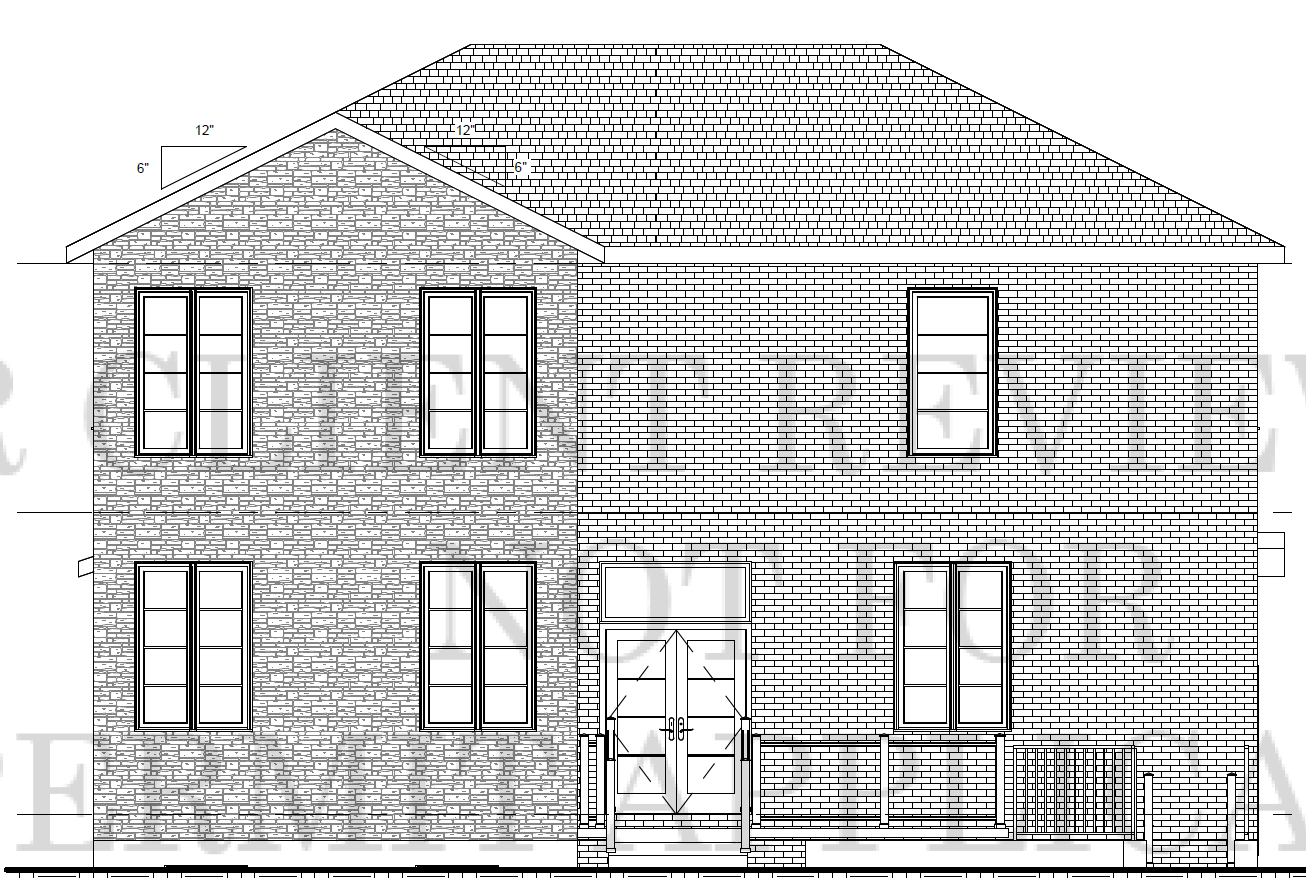 this is an elevation drawing for the back of a new house the brick is a red black brown brick mix and stone is a warm beige roof is black asphalt shingles windows frames are brown deck is a stained brown wood with black bannisters around the railings generate a realistic 3d render