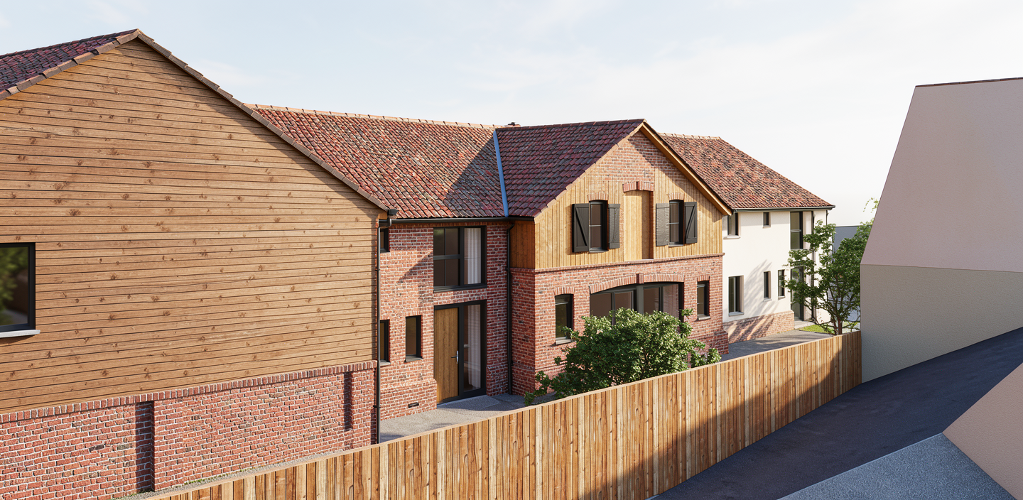 make this rear elevation photorealistic while keeping textures and architectural elements the same as selection add professional landscaping on a lightly wooded scene with good lighting that is in highlands north carolina use the following colors and materials lap siding to be c7c8ca in color corner boards to be c7c8ca in color shingle roofs are to be certainteed dimensional shingles in pewter windows to be white in color mutins in top window sash only window trim to be white in color sliding glass patio door to be white fascia to be white in color soffit to be white in color eaves to be white in color gutters and downspouts to be white in color deck to be stained ebony handrail to be stained ebony exterior lantern wall fixture at sliding glass patio door to be matte black foundation to be poured wall concrete