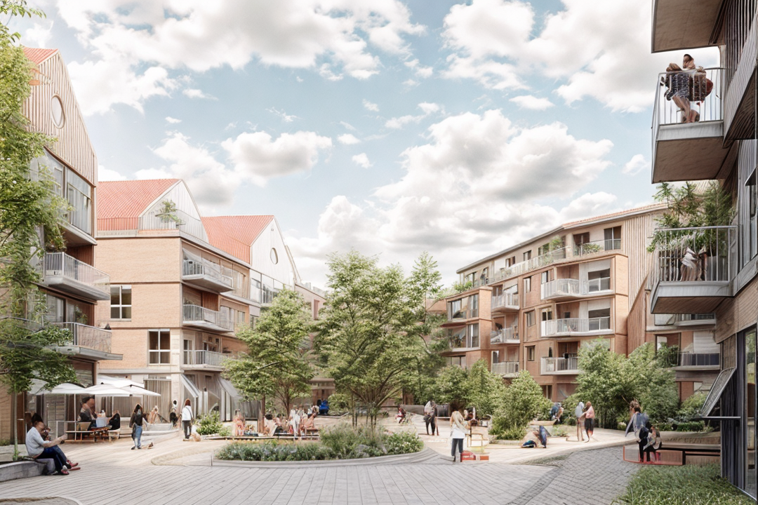 new interior using a color scheme in reference to the top two colors for walls and ceilings and the bottom two for sound panels on the wall use the pendant hanging lights as a light source for the room and the pine and oak forest as an exterior background