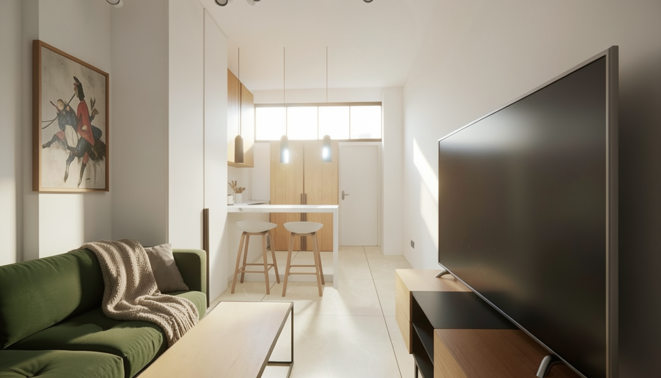 create a hyper realistic rendering interior shot of modern flat kitchen natural oak wood cabinets comfy sofa with throw artwork above sofa small modern textured rug tone should be relaxing and inviting the door leads to a bedroom no plants