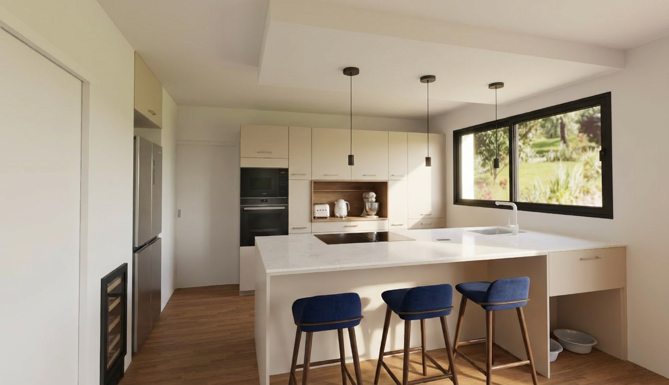 remplace le placard au dessus du frigo par une continuit de mur blanc et lisse sans poign e