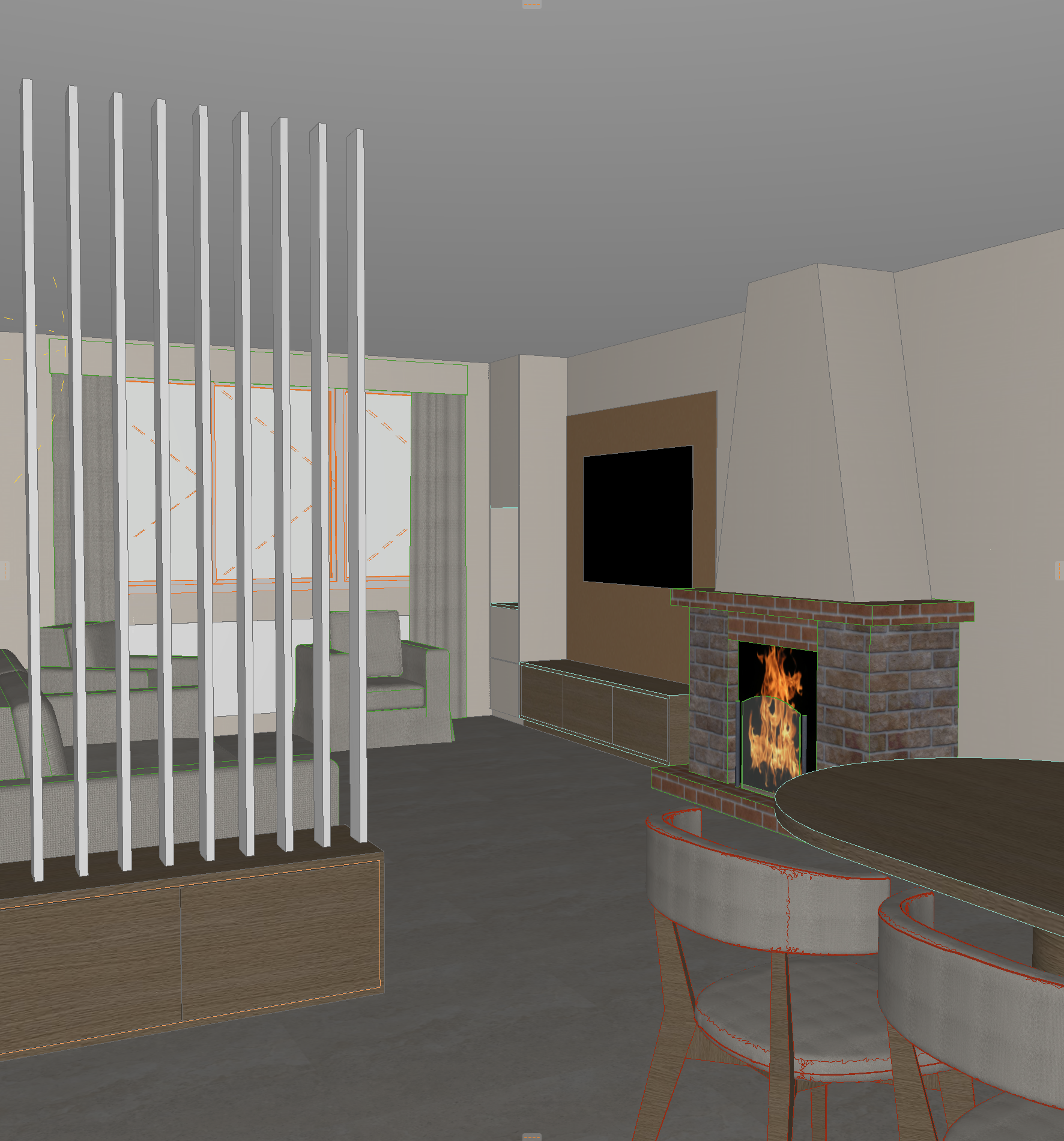add a japandi style ceiling pendant light in the living room centered above the seating area the pendant should be minimal warm and made of natural materials such as wood or rice paper add a modern coffee table in the living room using the same wood tone and finish as the existing dining table to maintain visual harmony keep the overall aesthetic cohesive warm and contemporary