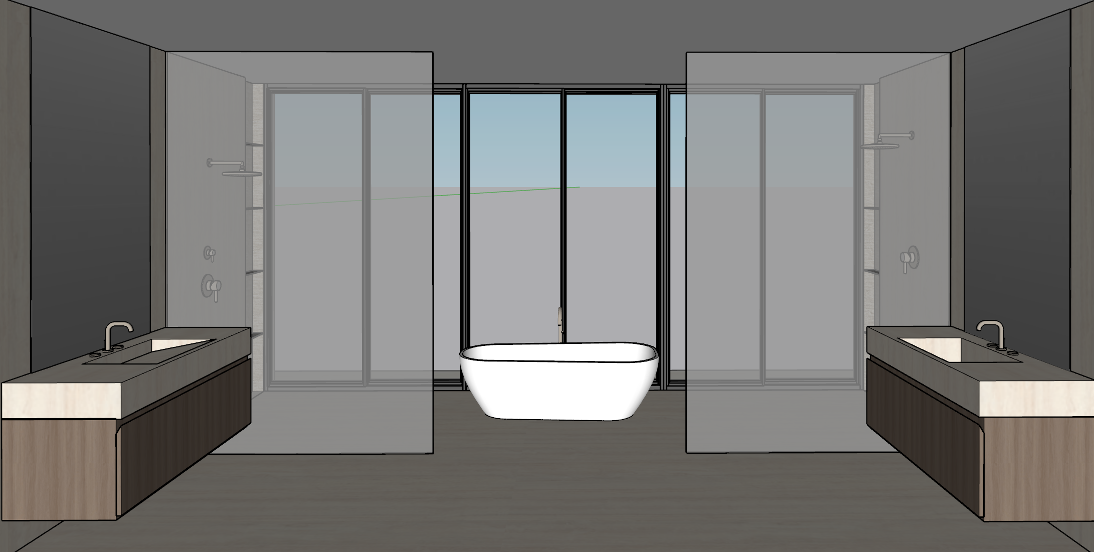 modern minimalist bathroom with a serene atmosphere render a luxurious free standing bathtub in pure white centrally positioned in front of a large glass window displaying a soft pastel blue sky the vanities on either side feature smooth polished wood with a rich walnut tone topped with light beige marble add sleek brushed nickel faucets for a touch of elegance walls and flooring in travertine slabs to complement the overall aesthetic soft ambient lighting to enhance the tranquil environment add led to the mirrors on the vanities the sliding doors leads to an outdoor seating area