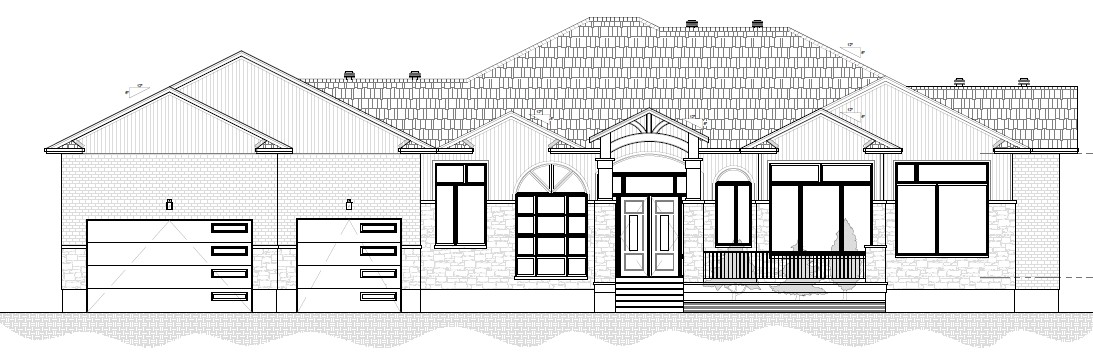 preserve the exact proportions window door locations roof geometry and massing from the cad drawing do not alter the architecture render the building with real world materials exterior cladding grey stone white board and batten roofing black shingles windows high performance glazing with subtle reflections and black trim and black frame doors realistic wood with black frame lighting natural daylight late afternoon sun environment realistic landscaping lawn shrubs small trees clean grading concrete driveway neutral suburban residential context no distractions camera eye level perspective slight angle not perfectly flat elevation 35 50mm architectural lens look style ultra realistic photo accurate high detail sharp focus professional architectural visualization quality suitable for real estate marketing and permit presentations output 4k resolution clean crisp edges no text no labels no people no artistic distortion or stylization