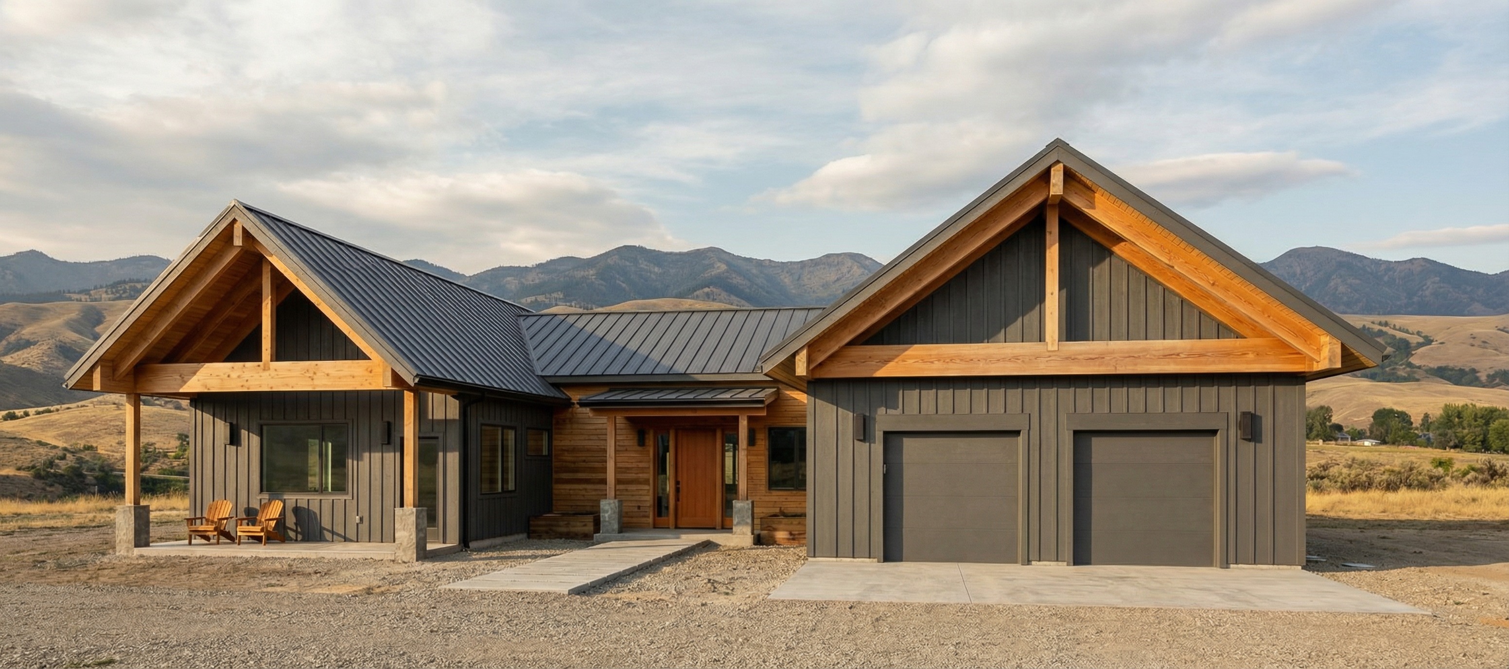 everything in the image stays the same except add a son in the sky a flock of birds in the sky a lens flare the garage door are a black metal