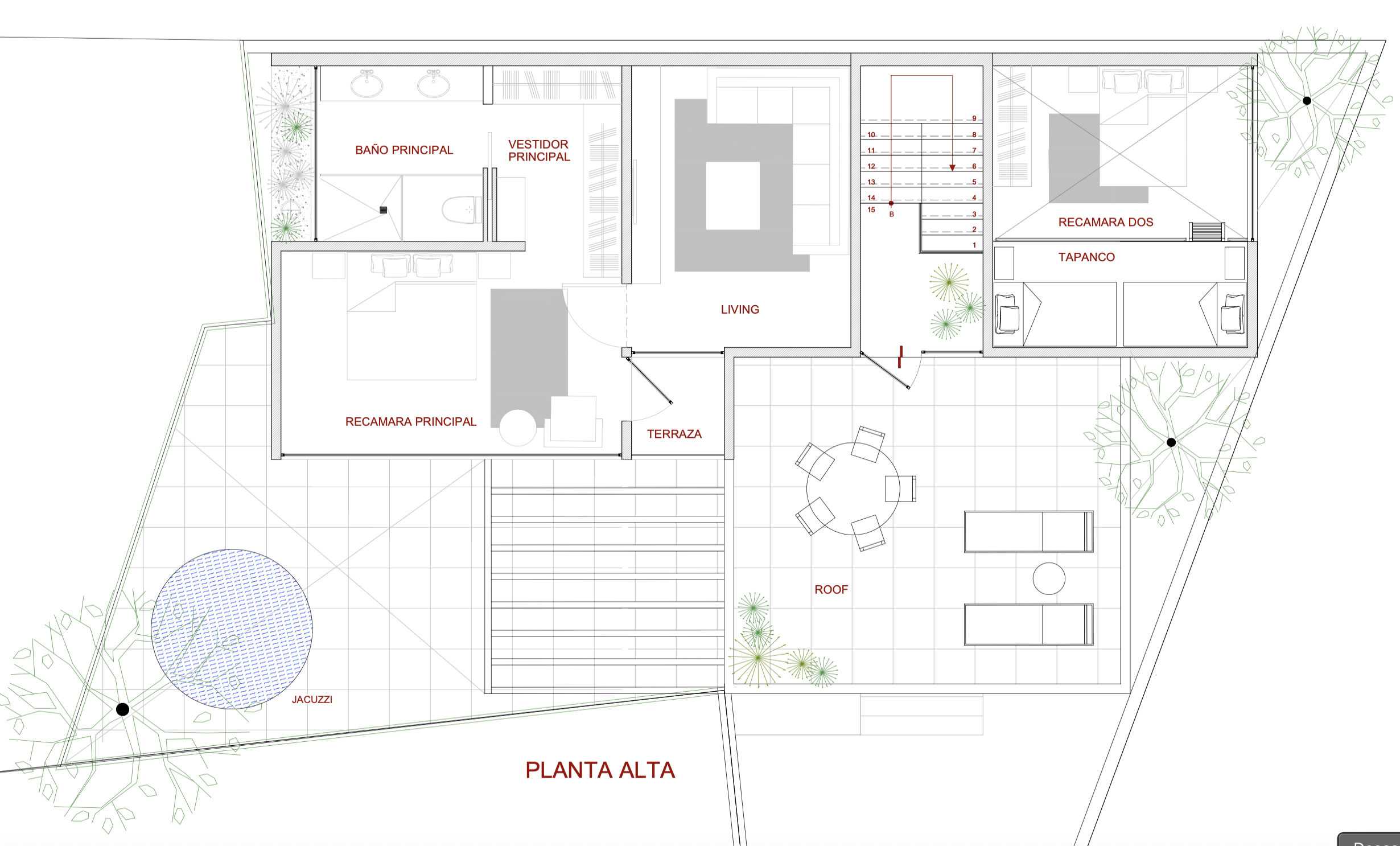 render an axonometric top view of modern house interior layout with a sophisticated and cozy atmosphere use warm beige and soft cream tones for the walls implement light oak wood for the flooring to give a natural touch incorporate modern furniture with sleek lines featuring a mix of matte white and dark gray use soft ambient lighting to enhance the mood add subtle greenery for a touch of freshness the open living space should feel airy and inviting with a seamless flow between areas maintaining a minimalist yet elegant aesthetic and a jacuzzi terrace with black limestone