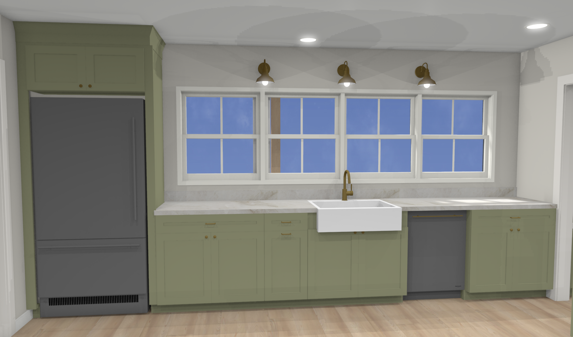 show this render to be very well lit show trees and a neighborhood outside the window