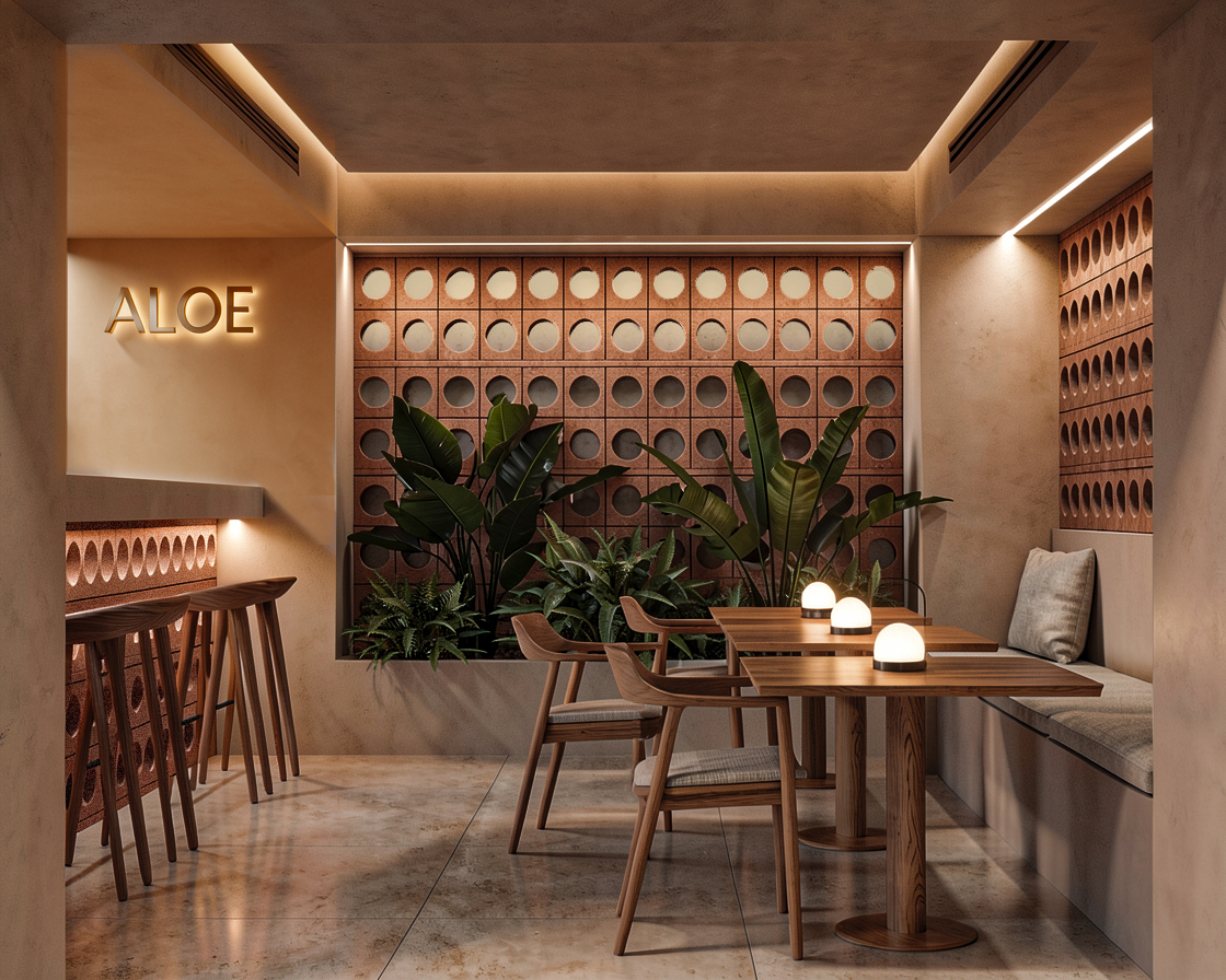 type of image photorealistic render of a contemporary restaurant interior scene framing eye level interior perspective showing a small dining area with a bar on the left tables on the right and an indoor garden at the back keep the exact original composition framing and layout unchanged elements preserve all existing elements exactly ceramic lattice bar front wooden tables chairs upholstered bench seating tropical plants perforated back wall and warm indirect lighting remove all existing bar stools completely replace them with exactly 5 stools with the following characteristics round seats no backrest material natural wood same tone and finish as tables and chairs style boho inspired simple slightly handcrafted feel soft edges geometry clean lightweight cylindrical or subtly tapered legs arrangement all 5 stools aligned in a single row directly in front of the bar lattice evenly spaced positioned close to the bar not pulled away lighting maintain warm indirect perimeter lighting soft diffuse ambient light no change in intensity or direction color texture warm neutral palette beige sand terracotta natural wood preserve all original material textures plaster ceramic wood stone style contemporary mediterranean interior design with subtle boho influence in the stools strong material coherence quality high resolution photorealistic render soft shadows well defined materials constraints do not add or remove any other furniture do not change camera angle proportions or layout do not alter vegetation lighting or architecture avoid duplication or blurry elements ensure a clear and readable count of exactly 5 stools all properly aligned and attached visually to the bar