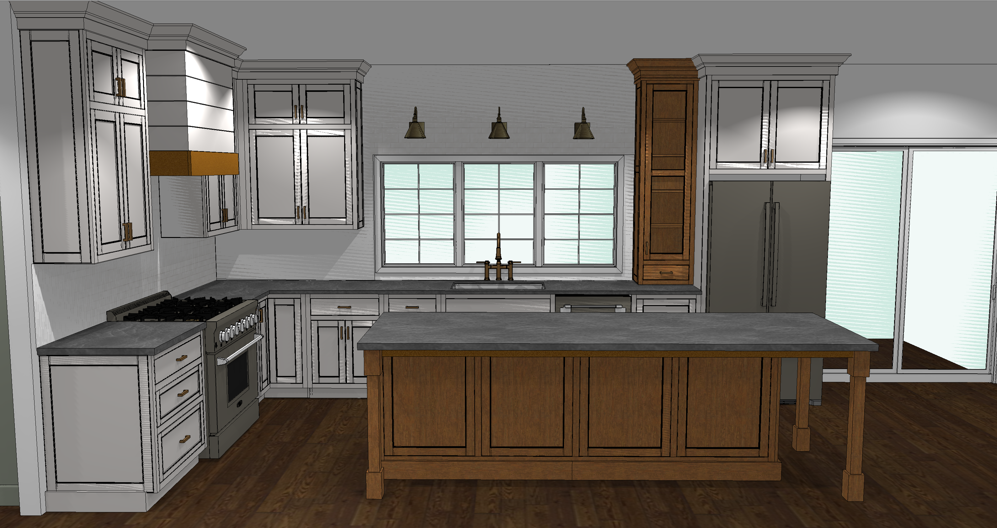 i need this image to be enhanced to look realistic keep everything the same as pictured the perimeter cabinets are white flat panel inset cabinets the island is stained a soft leathered brown stain keep all other wood accents remain as imaged backsplash is white stacked subway with a subtle ripple that reflects light add soft lighting to ceiling and under cabinets