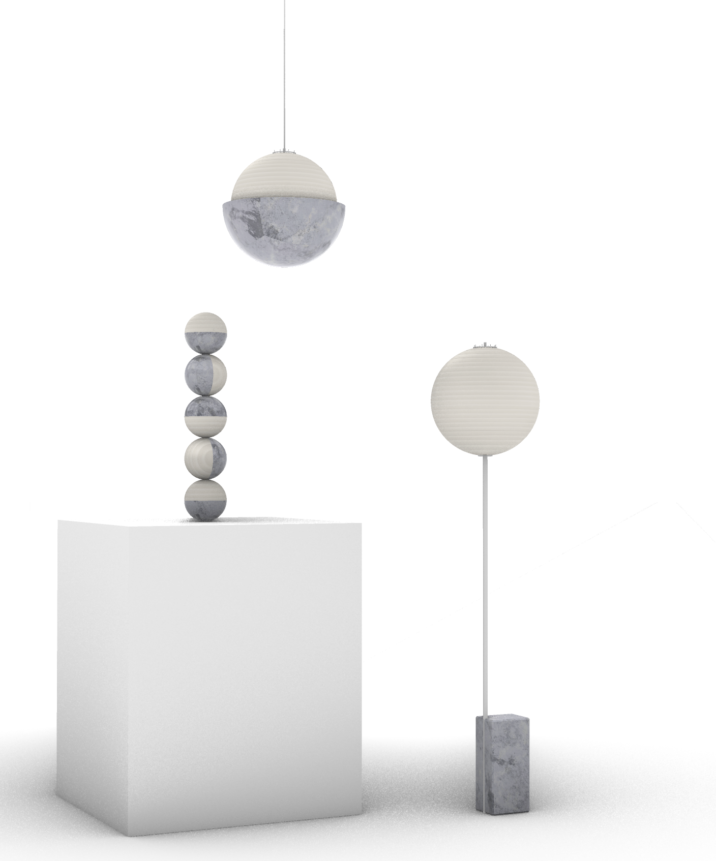 create a minimalist interior scene featuring a central matte white pedestal place a tower of five sphere lights on the pedestal lights going in different directions alternating between paper akari lights and textured marble grey suspend a large spherical pendant light above showcasing a blend of paper akari light on top and marble on the bottom add a freestanding lamp with a round paper akari light and a marble grey base use soft diffused lighting for an ethereal and serene atmosphere with a clean white background to emphasize simplicity and elegance