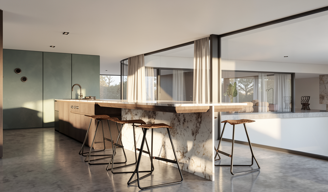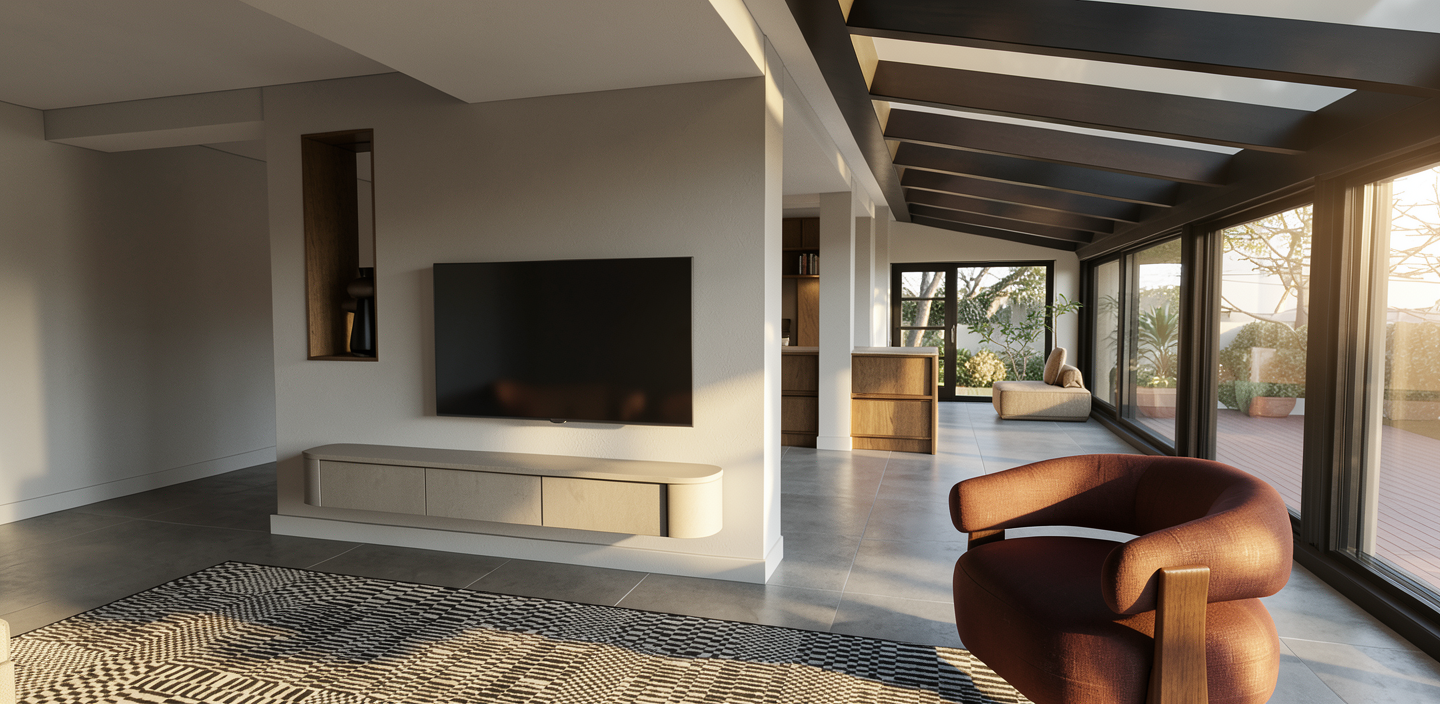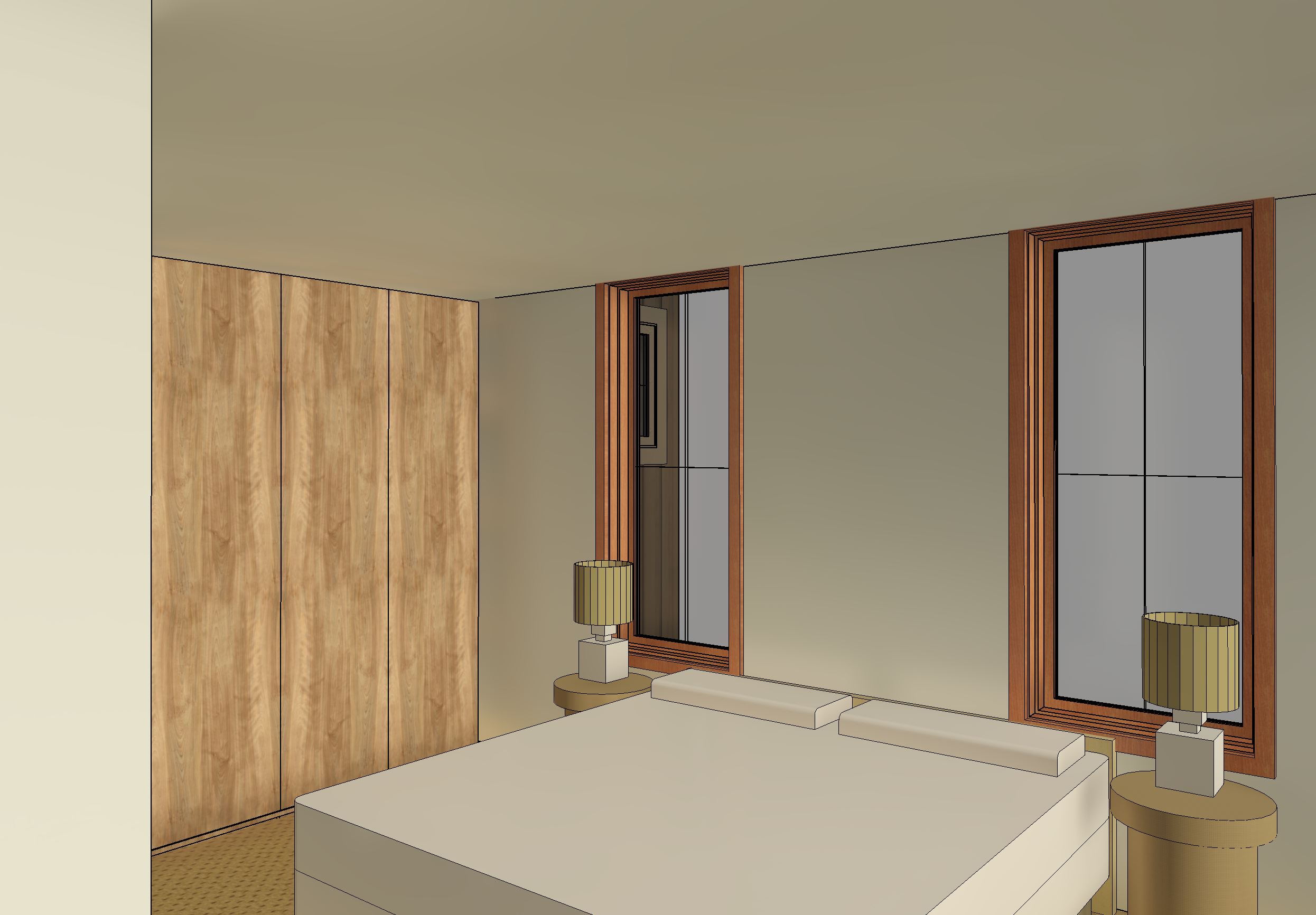 use the uploaded revit 3d view as the exact base reference do not change camera position or focal length perspective or crop any architectural geometry walls floors ceilings windows doors built in elements or joinery layout proportions or placement of any features preserve exactly all linework alignment edges corners and openings spatial proportions and ceiling heights style brutalist bedroom with strong wood panel influence monolithic calm minimal architectural heavy grounded forms with a refined warm restraint material palette full height wood panelling dark oak smoked oak or walnut tones expressed panel joints and grid rhythm raw or honed stone elements bed plinth side surfaces or floor accents matte plaster or concrete contrasts where needed minimal metal accents blackened steel or dark bronze bed joinery low platform bed integrated or built in bed may read as part of the architecture plinth or continuous base integrated bedside elements no loose clutter concealed storage flush panels detailing deep shadow gaps and reveals thickened edges and solid proportions minimal ornamentation focus on mass and alignment repetition and rhythm in panel layout styling extremely restrained neutral bedding linen wool in off whites taupe charcoal one or two sculptural objects only no visual clutter lighting soft indirect lighting concealed led strips warm tone low moody ambient light minimal direct fixtures render style ultra realistic slightly moody soft contrast calm cinematic but controlled high end architectural editorial negative no redesign no geometry changes no moving elements no added decorative clutter no bright or glossy finishes no over lighting or hdr effect strictly maintain original revit geometry any deviation is incorrect