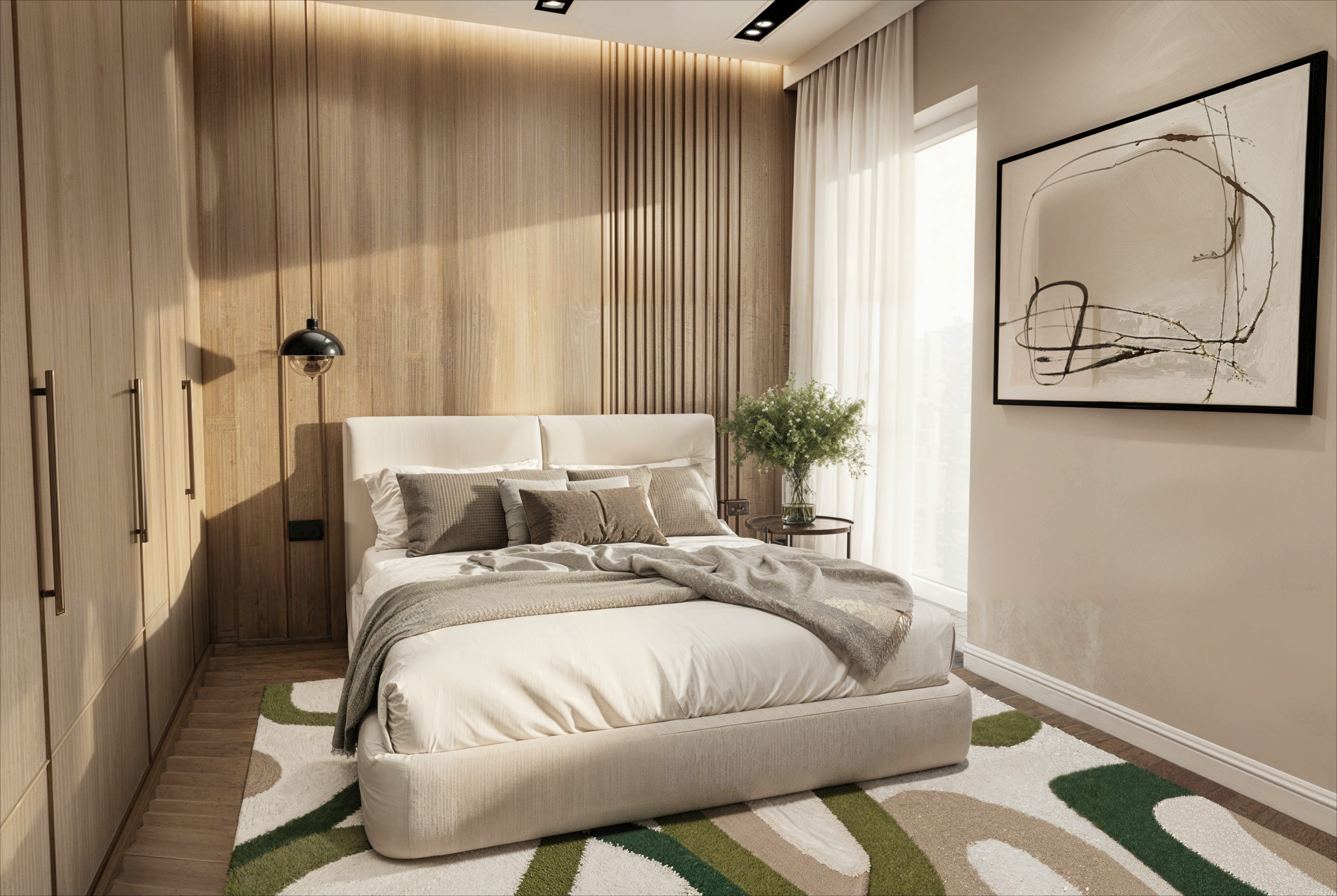 a serene modern bedroom with warm natural tones light oak wood paneling on one wall soft beige paint on the other walls a cozy plush bed with cream colored sheets and a variety of pillows in a mix of beige and soft gray shades a knitted throw in a deep taupe draped over the side a single pendant light with a brass finish hanging by the bed casting a warm glow soft flowing white curtains framing a large window a minimalist abstract painting with muted earth tones and black accents on the wall hardwood flooring in rich walnut brown adds warmth to the space while a small wooden side table with a white vase of greenery provides a touch of nature the atmosphere is tranquil and inviting bathed in gentle natural light
