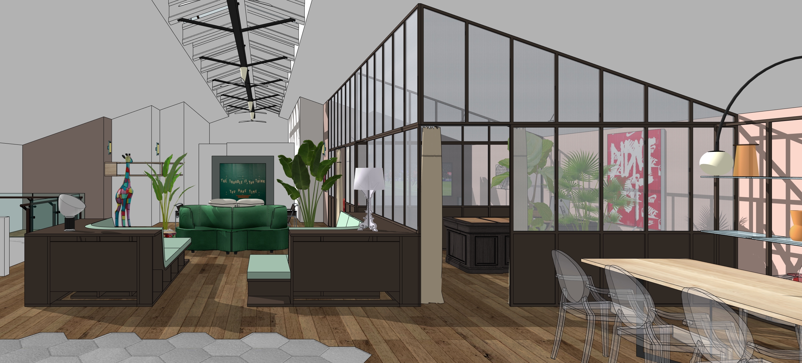 create a cozy modern loft interior filled with natural sunlight from the top emphasize a spacious open plan with tall glass walls that reveal vibrant green tropical plants use a neutral color palette for the walls and incorporate a warm wooden floor to add grounded earthiness a plush green sofa serves as the centerpiece surrounded by sleek dark wood office furniture feature transparent stylish ghost chairs around a light wood dining table add a colorful abstract sculpture for a pop of color complementing a decorative art piece with splashes of red and white ensure a balanced composition with ambient lighting to create a serene inviting atmosphere