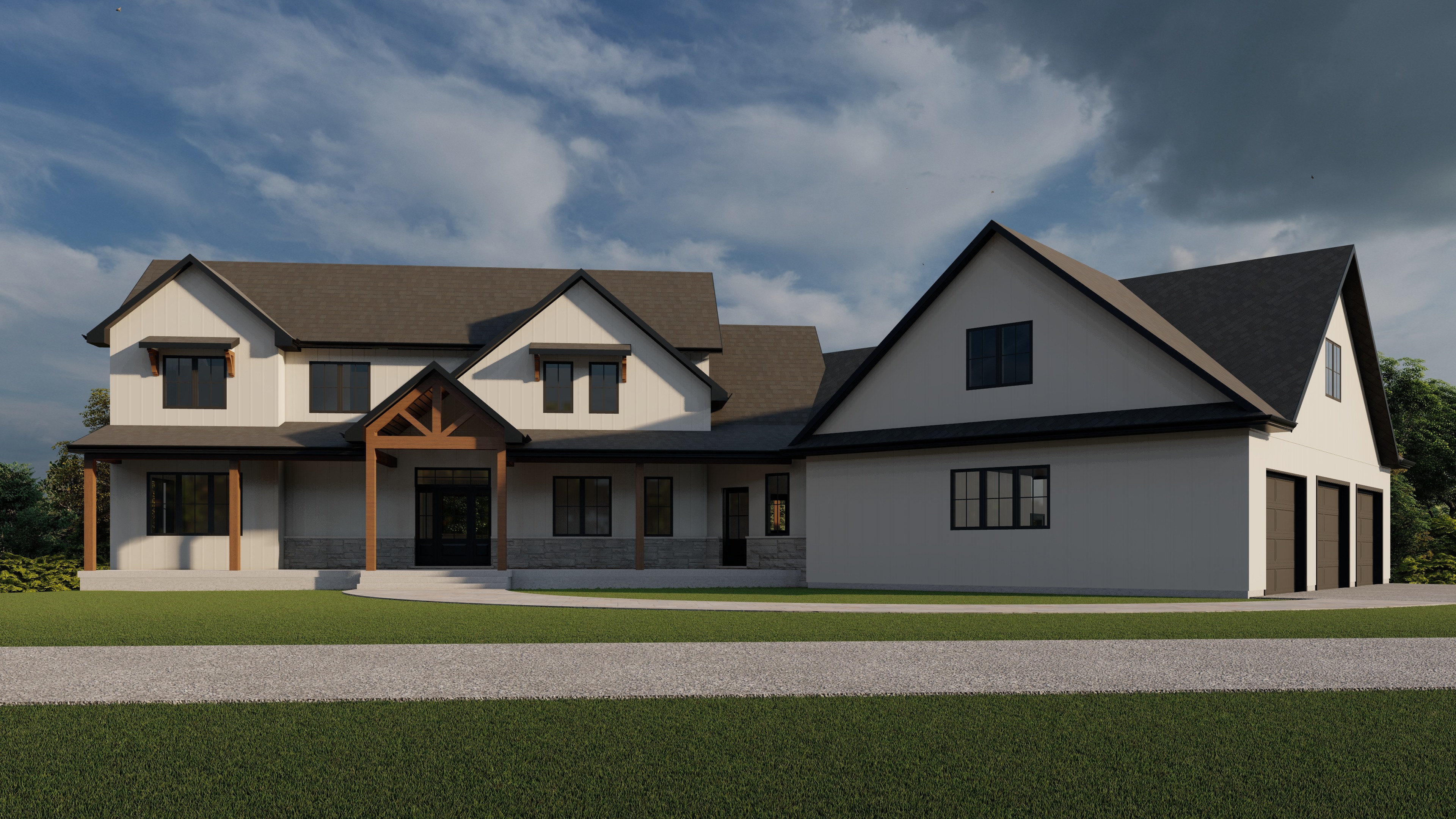 maintain colors realistic grass realistic sky soft shadows enhance landscape make house realistic vertical egg shell white board and batten siding add minimal flower shrub garden in front of porch