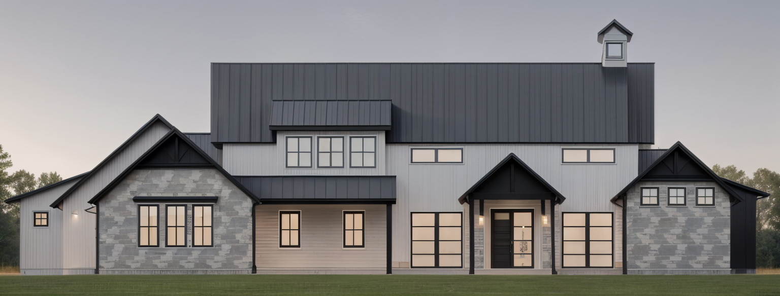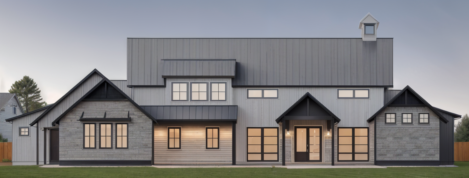 beaux arts exterior shot black steel roof dark gray siding gray and white stone and medium brown wood accents architecture
