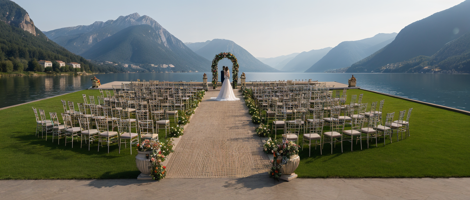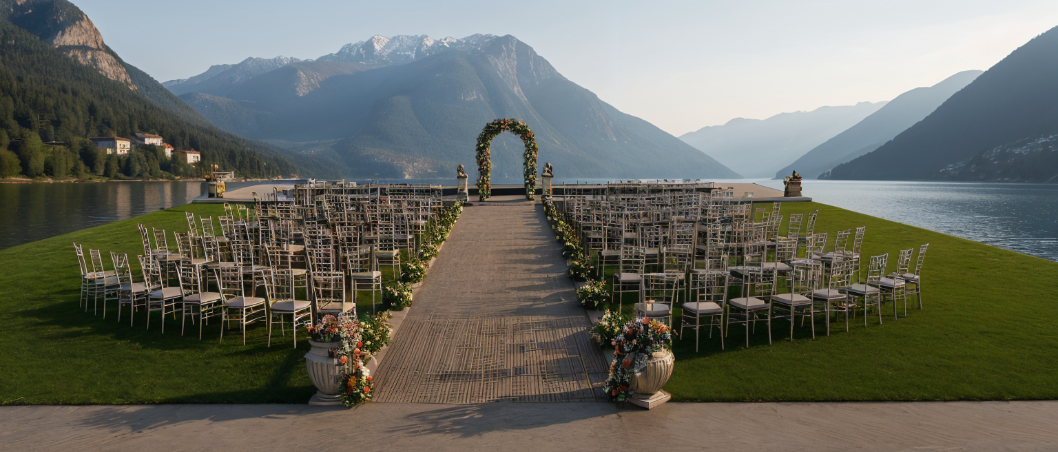 add a realistic background of lake como italy keep the reference model exactly as it is with original colours and materials place lake como s landscape in the background only showing the lake surrounding mountains and italian style atmosphere make sure the background integrates naturally with the perspective of the model add a bride and groom dancing together