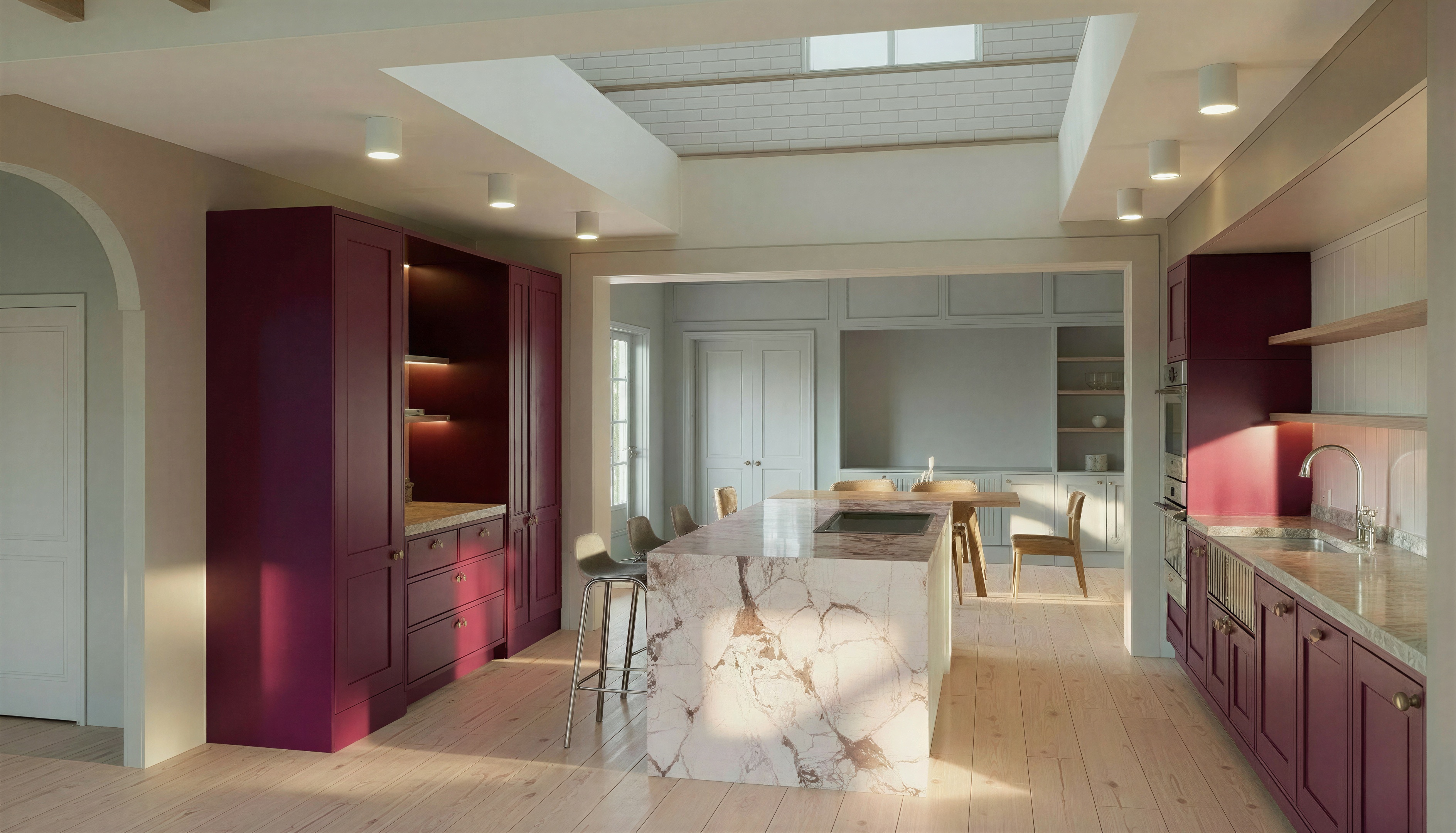 soft natural daylight from rooflight above kitchen island and remove artificial lights from the cabinets