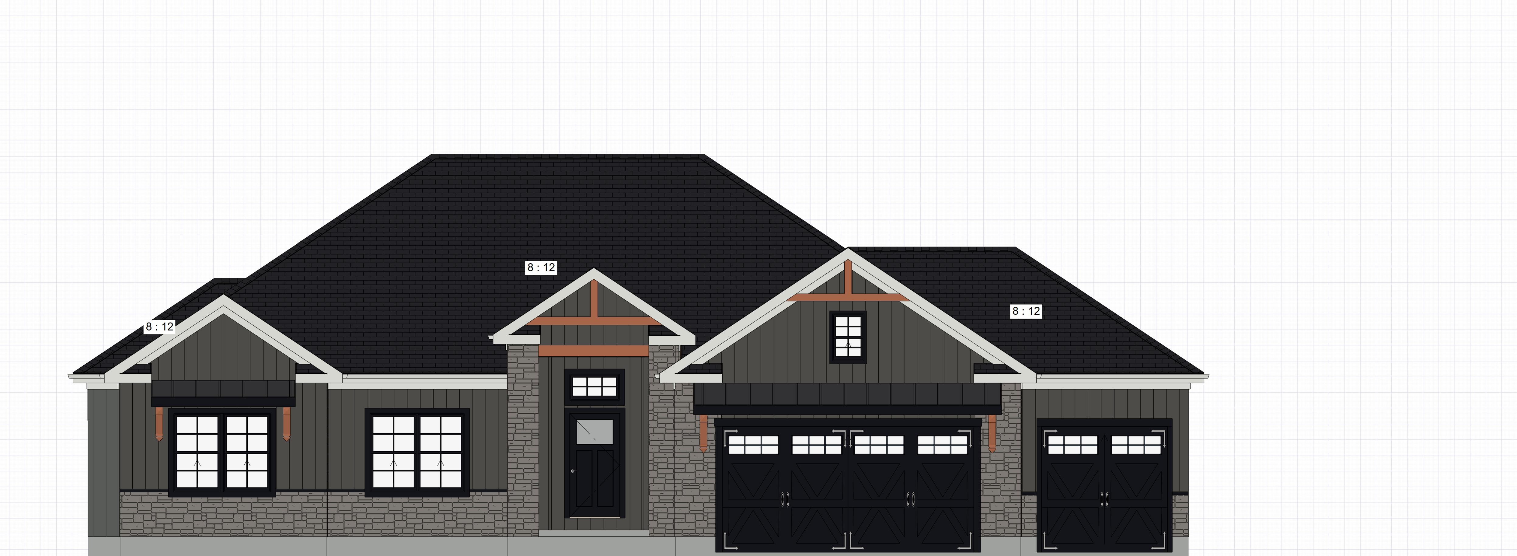 create a full color photorealistic rendering of this home elevation include driveway and landscaping the home is on large rural lot so there will not be homes close by next door use a modern gray color scheme with board and batton siding the window sashes are black