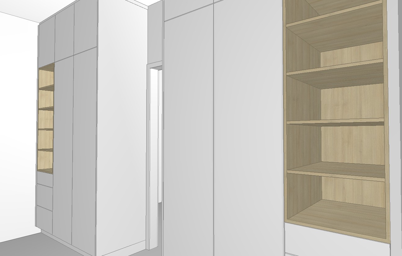 add natural light or down lights to brighten room add wardrobe decor and add long slim timber look handles to tall doors and base drawers have someone standing and opening a tall door cabinet